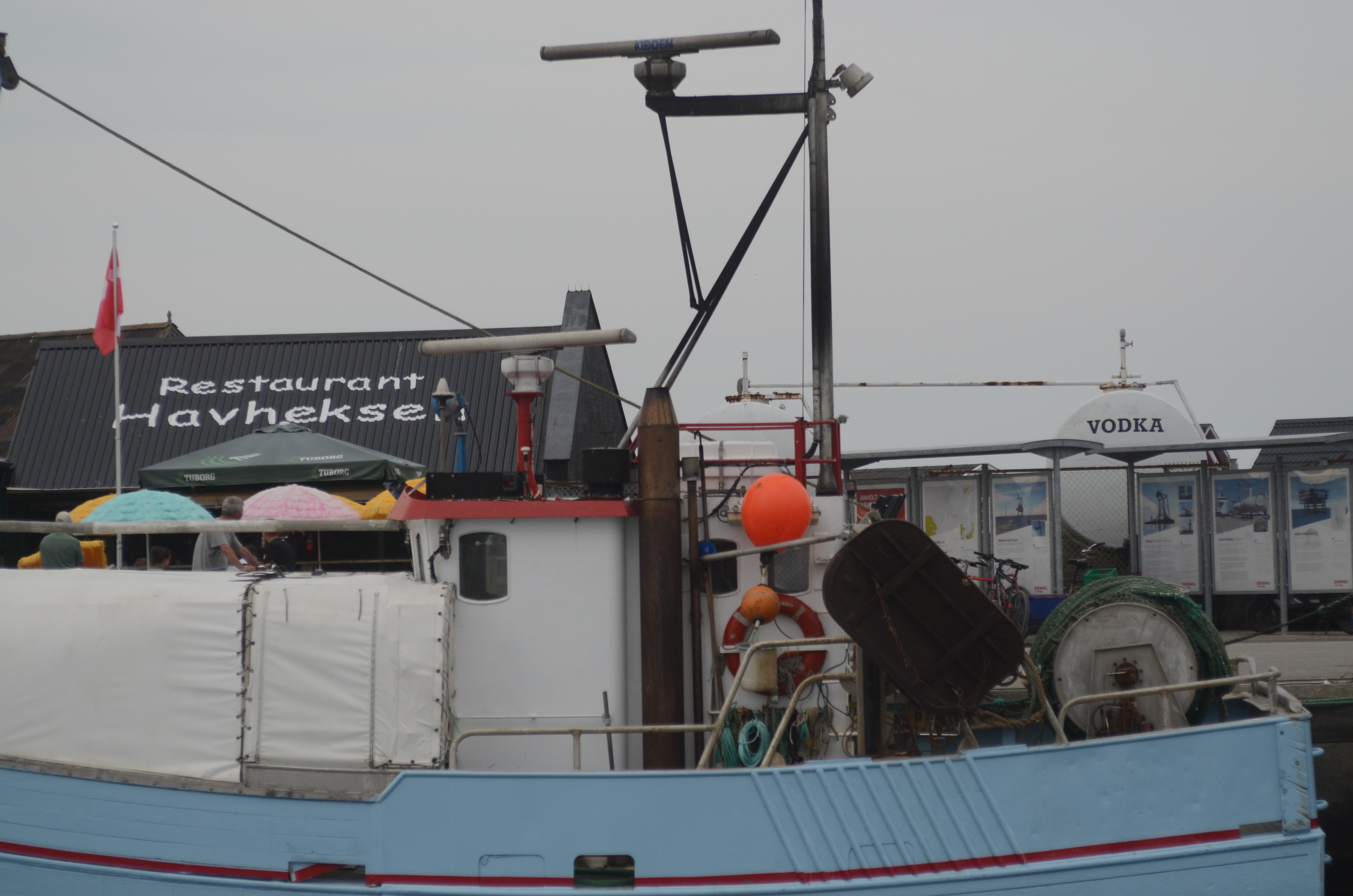 Vejrudsigten siger regn, regn og mere regn. Hmmm. Nej vel? Cykle i regnvejr? Vi har jo vel ferie? Det kan vente til i morgen, så vi nøjes med at går en tur rundt i Østerhavneby. Vi så hovedstrøget, samtlige butikker, sportshallen, skiltet der viste vej til golfbanen (3km), samt hvad der nu var at se på havnen.