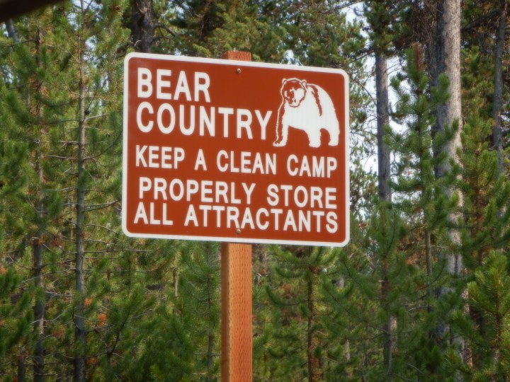Der er skilte overalt ved indkørslerne til campingpladserne, på spisebordene og ved toiletfaciliteterne. Der advares således mod bjørnene: