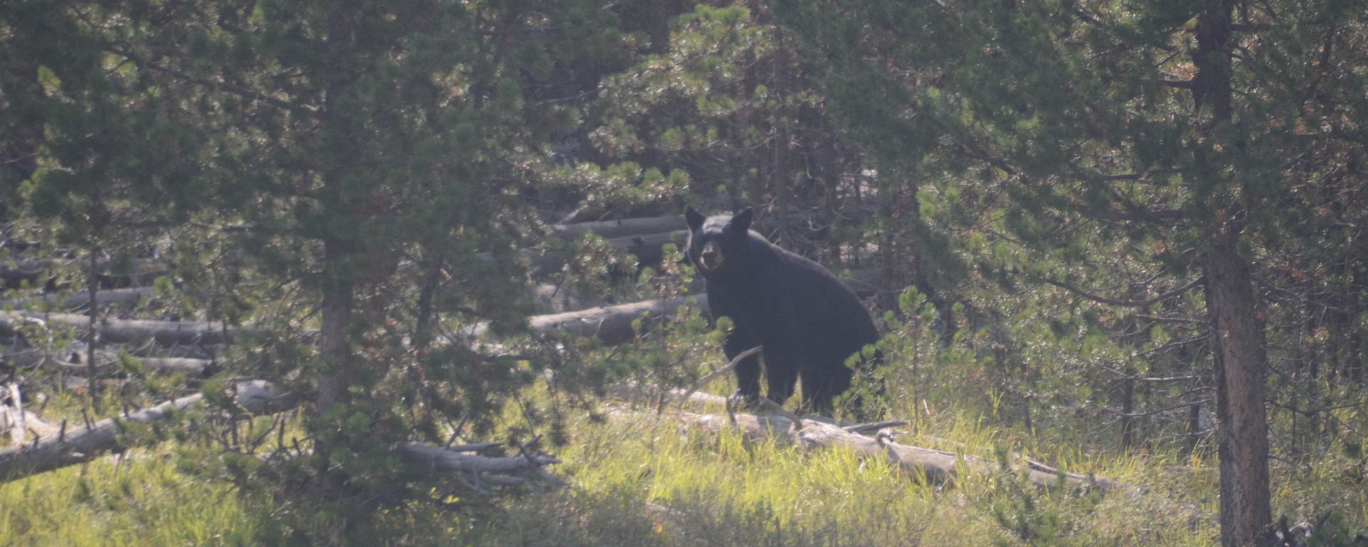 Vi når at se 3 bjørne i Yellowstone. En sort bjørn når jeg at spotte nede på den anden side af floden, hvor vi kører, og vi stopper selvfølgelig for at tage billeder og video. Den er ikke særlig fotogen, rejser sig op på bagbenene og brøler, hvorefter den lunter tilbage ind i skoven.