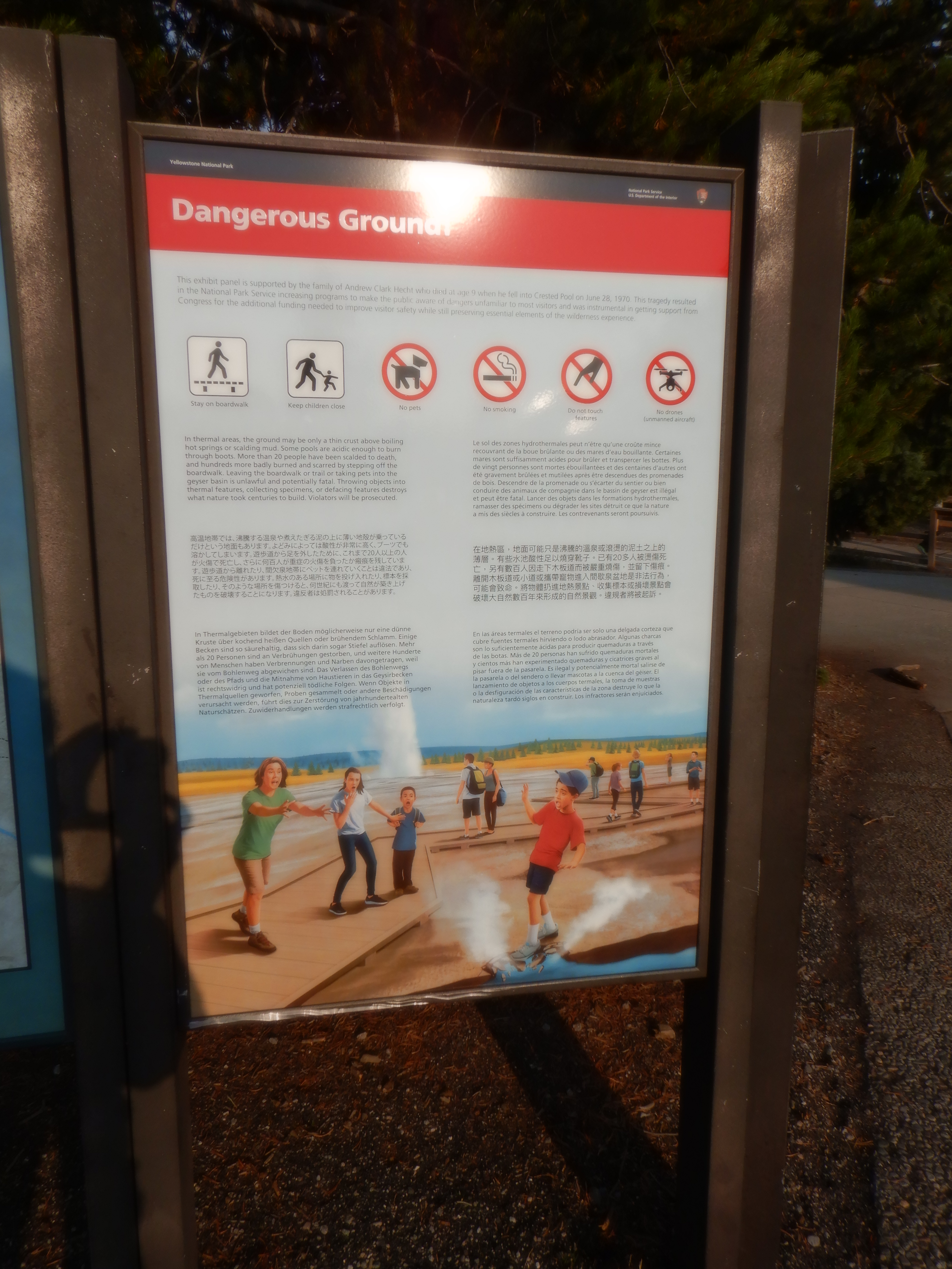 Det er meget populært at besøge gejserområderne, og det er chokerende at læse, at flere hundrede personer har fået alvorlige forbrændinger ved at gå ud på en hot spring eller mudpot, da man ikke tror, at de er varme. Skiltet nedenfor er sat op af forældrene til en 9 årig dreng, der døde af sine forbrændinger, som han pådrog sig, da han bevægede sig væk fra de officielle gangstier, der er lavet rundt om gejserne og hot springs.