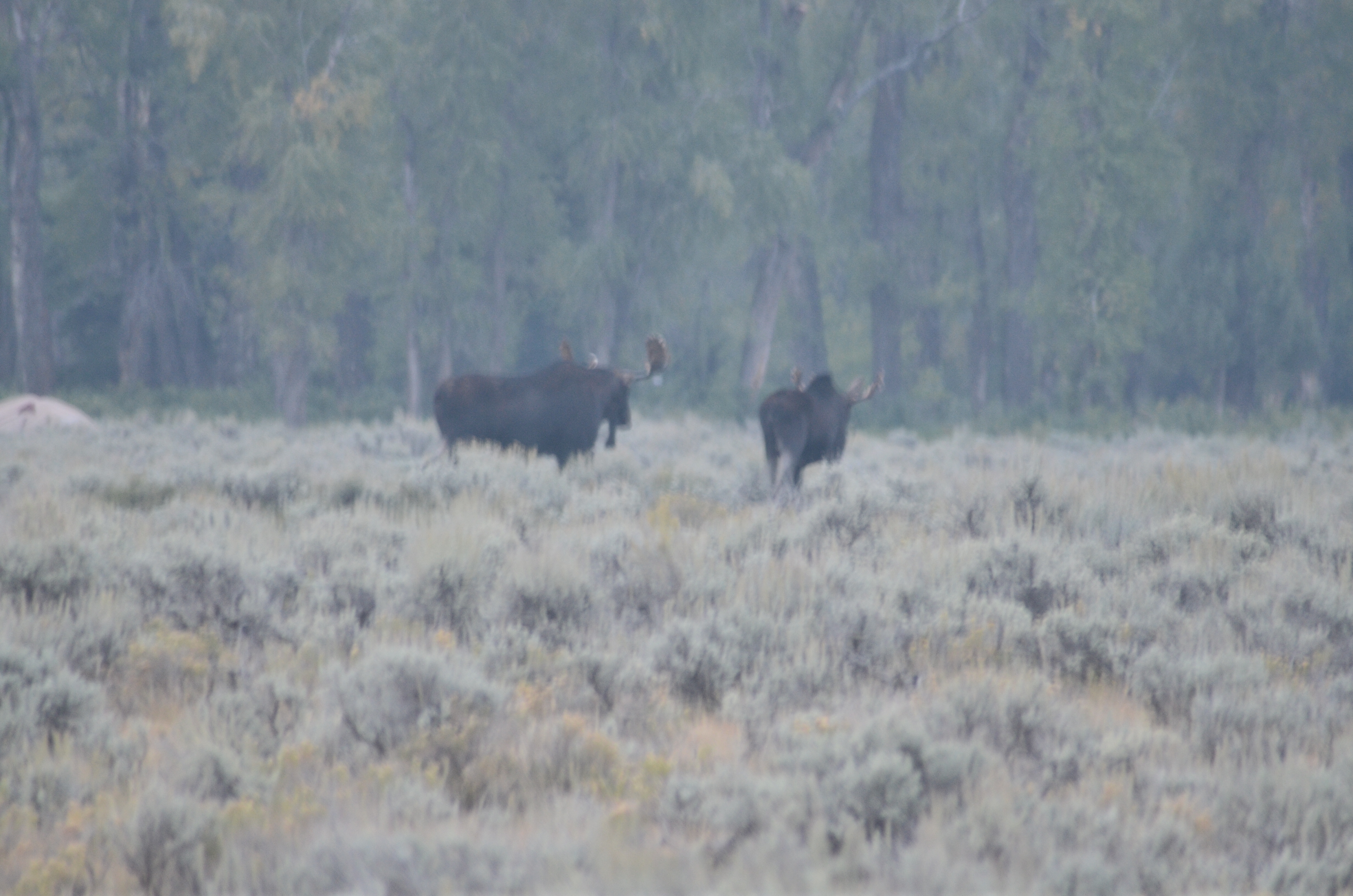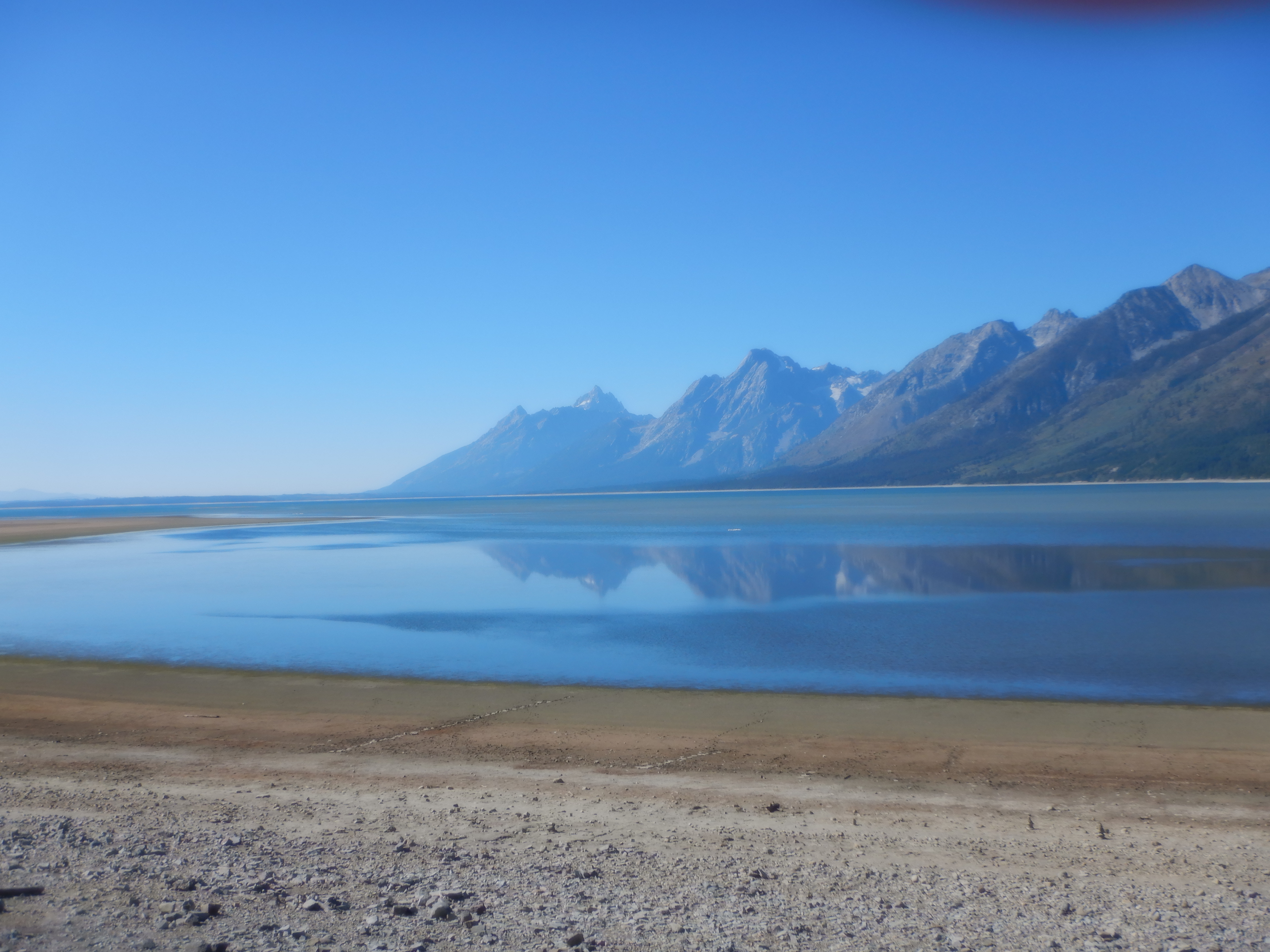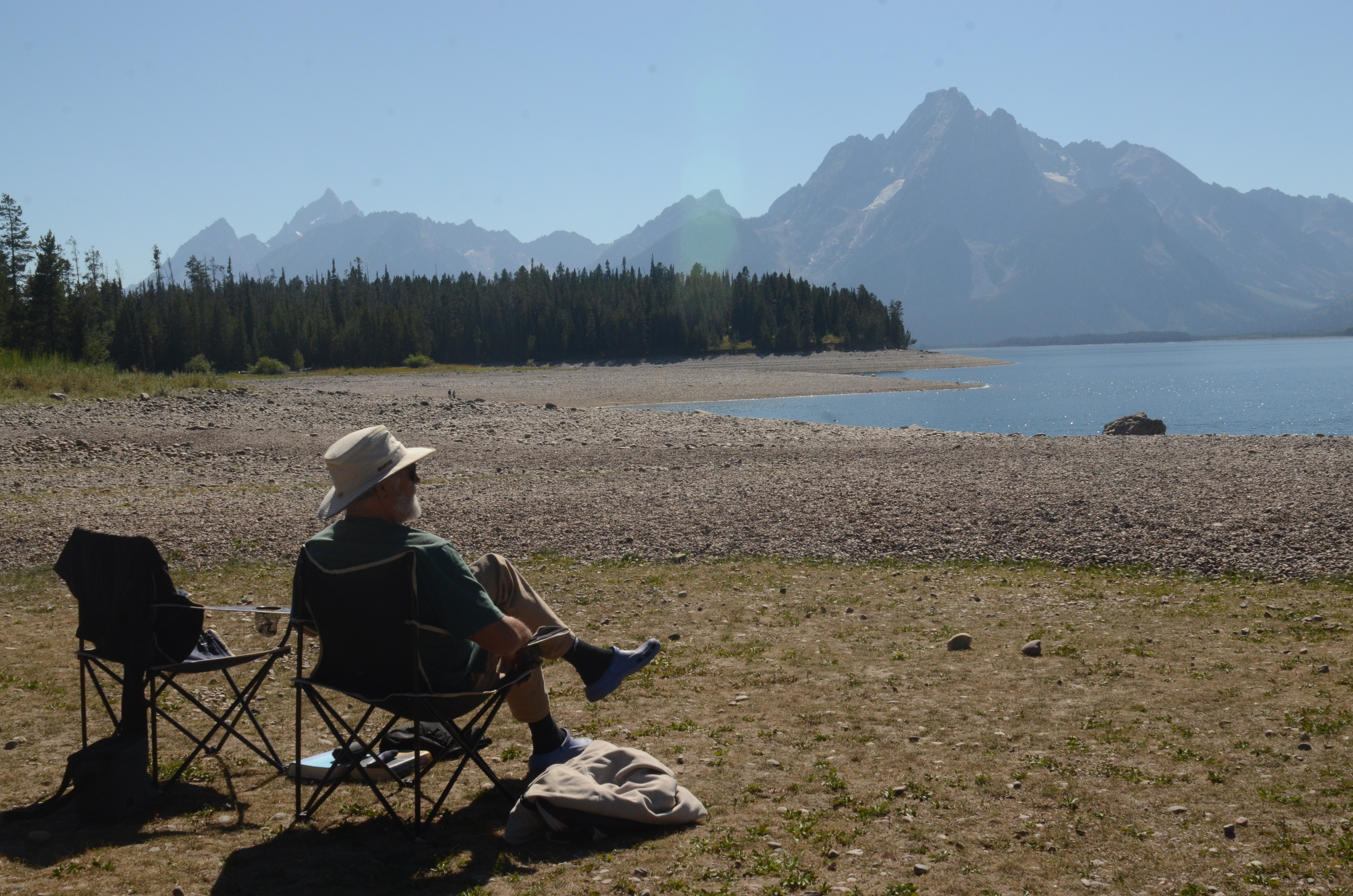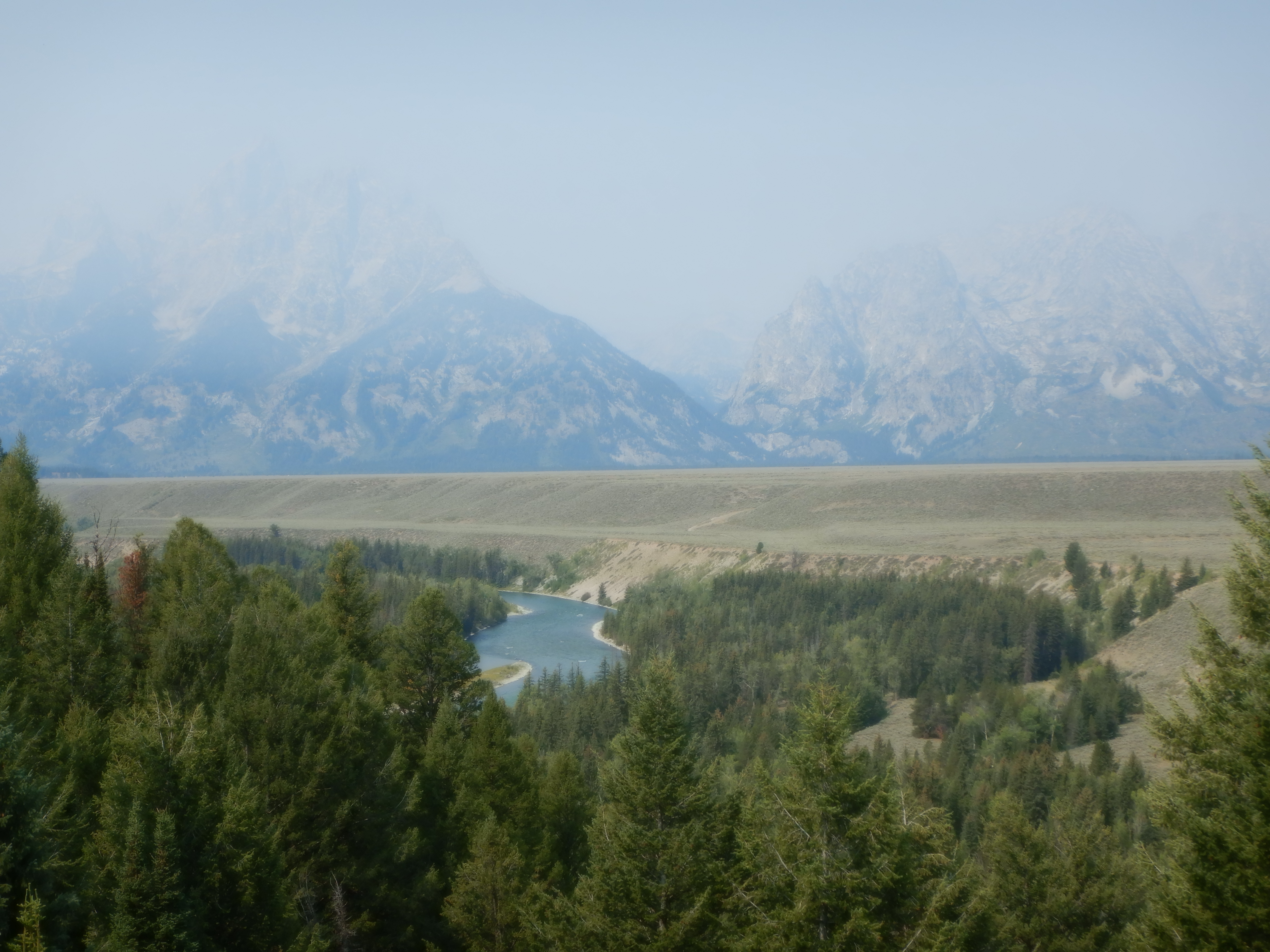 Vi kører nu sydover ned til Grand Teton National Park, som går næsten ud i ét med Yellowstone National Park. Pat og Jim har i sidste uge opholdt sig ved Grand Teton. De er lidt ærgerlige over den dårlige sigtbarhed, der skyldes røg fra de store skovbrande i Californien, Oregon og Canada. Under deres fem dages ophold her nåede de aldrig at se den meget seværdige panoramaudsigt udover Grand Tetons bjergkæde, som man kører langs. Heldigvis og helt exceptionelt har vi klart solskinsvejr, da vi kører ind i Grand Teton National Park. En ranger (parkens politibetjent) lykønsker os med det gode vejr, for det har ikke været klart vejr i månedsvis. Det er ingen overraskelse for amerikanerne, der er vant til, at røgen på dette årstid bevæger sig flere tusinde kilometer ind i landet. Det er svært for en dansker at forstå. De store skovbrænde skyldes tørke og lyn, naturens gang altså, og ikke skødesløs handlinger fra personer – og dog, måske har vores forurening indflydelse herpå?