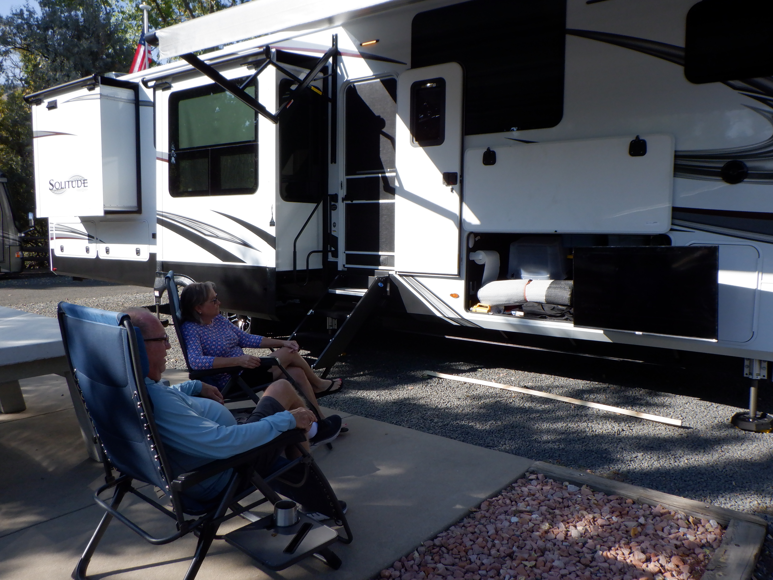 Det er første gang, at vi skal campere på en privatejet campingplads. Puha, hvor er det dyrt 700 kr. for en overnatning, men så er det med ”full hook-ups”, hvor vi kan tilkoble os strøm, vand og kloak. Vi har booket 3 nætter, da de øvrige meget billigere føderale campingpladser er optaget. Men da receptionisten meddeler os, at vi skal betale 35 kr. per mand for at få et brusebad, så bliver fru Breuning nærig og meddeler, at vi kun bliver én nat. Argumentet for at tage et beløb for brusebad er, at campisterne i de store campere bruger altid deres eget bad, derfor må andre der ikke har eller vil bruge deres eget brusebad betale herfor. De kan rende og hoppe – det burde være omvendt, at vi får reduktion i den høje pris, når vi benytter eget bad. Vi benytter selvfølgelig Caprises brusebad. Men udsigten fra campingpladsen fejler ikke noget – det er alle pengene værd.
