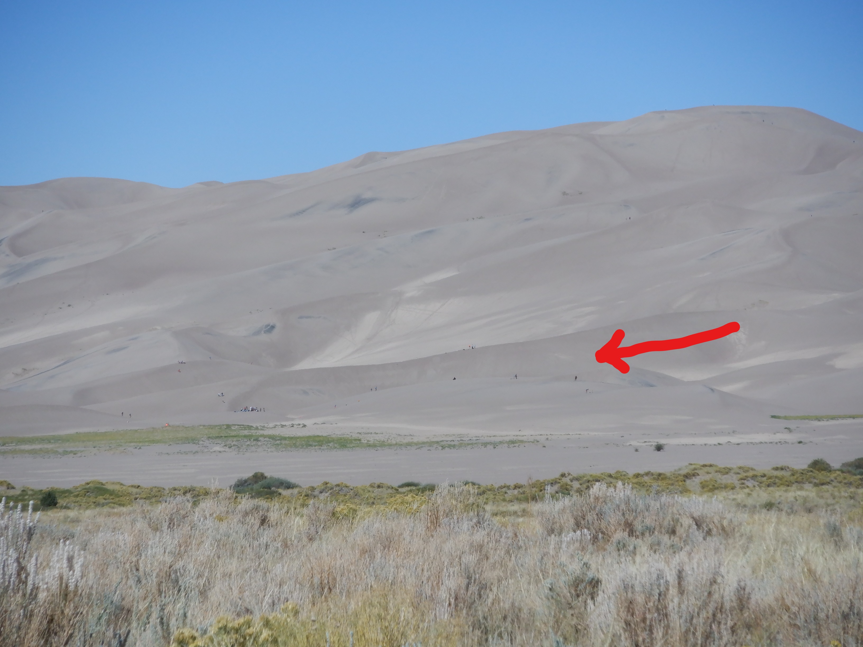 Næste morgen drøner vi videres og kører gennem bjergene og ud på det man herover kalder The High Chaparral. The High Chaparral er kæmpe højt beliggende dal.  Disse dale ligger i lidt over 6000 fods (2 kilometer) højde.  Landet er fladt og helt ude i horisonten kan man ane toppen af de omkringliggende bjerge.  Der kommer et skilt, Great Sand Dunes National Park med pil der viser til venstre.  Colorado Alligator Farm ligger på hjørnet (hvorfor har man alligator midt i en halv-ørken?  Turister vil åbenbart betale for at se dem. Det er en mindre vej (meget mindre), der dog er asfalteret og skiltet fortæller os at der er 65 kilometer til Parken.  65 kilometer af bogstavelig talt fuldkommen lige vej.  Den er som en streg slået med en lineal.  Hvis vi kunne have bundet Caprises rat fast, vil vi kunne tænde autopiloten og gå om bagved og lægge os til at sove.