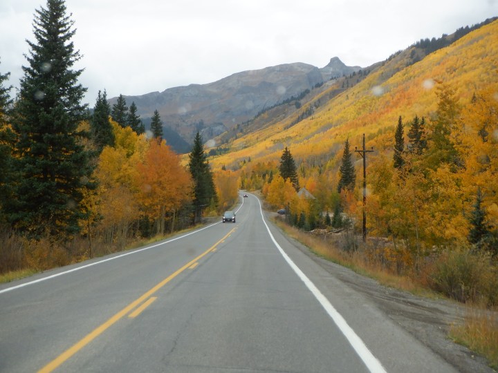 Turen, dårligt vejr til trods, (det regnede det meste af vejen) var ualmindelige smuk. Aspen træerne var i fuld flor og viste sig i brillante gule og orange farver.  Hele bjergsider var som om de var en stor flamme.