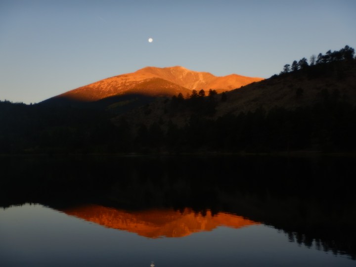 Som i kan læse er vores tur begivenhedsrig. Vi ser og oplever meget, men vi er jo slet ikke nået til Black Canyon endnu.  Der er en campground i Black Canyon, men vi har erfaret (gennem internettet) at alt er optaget.  Men cirka 40 kilometer fra Parken er der en National Forest med Elk Creek Campground, en lejrplads der ligger ved Gunnison floden, der hvor den er blevet dæmmet og der er en stor sø.  Her er det ikke gratis, vi må punge ud med 10 dollars (puha, hvor vi da flotter os). Vi ligger godt her, nyder solnedgangen og det at vi er næsten fuldkommen alene.  Rådyrene går gennem lejeren jævnligt og der er store skilte der fortæller at her er der bjørne (som der er overalt i Rocky bjergene).