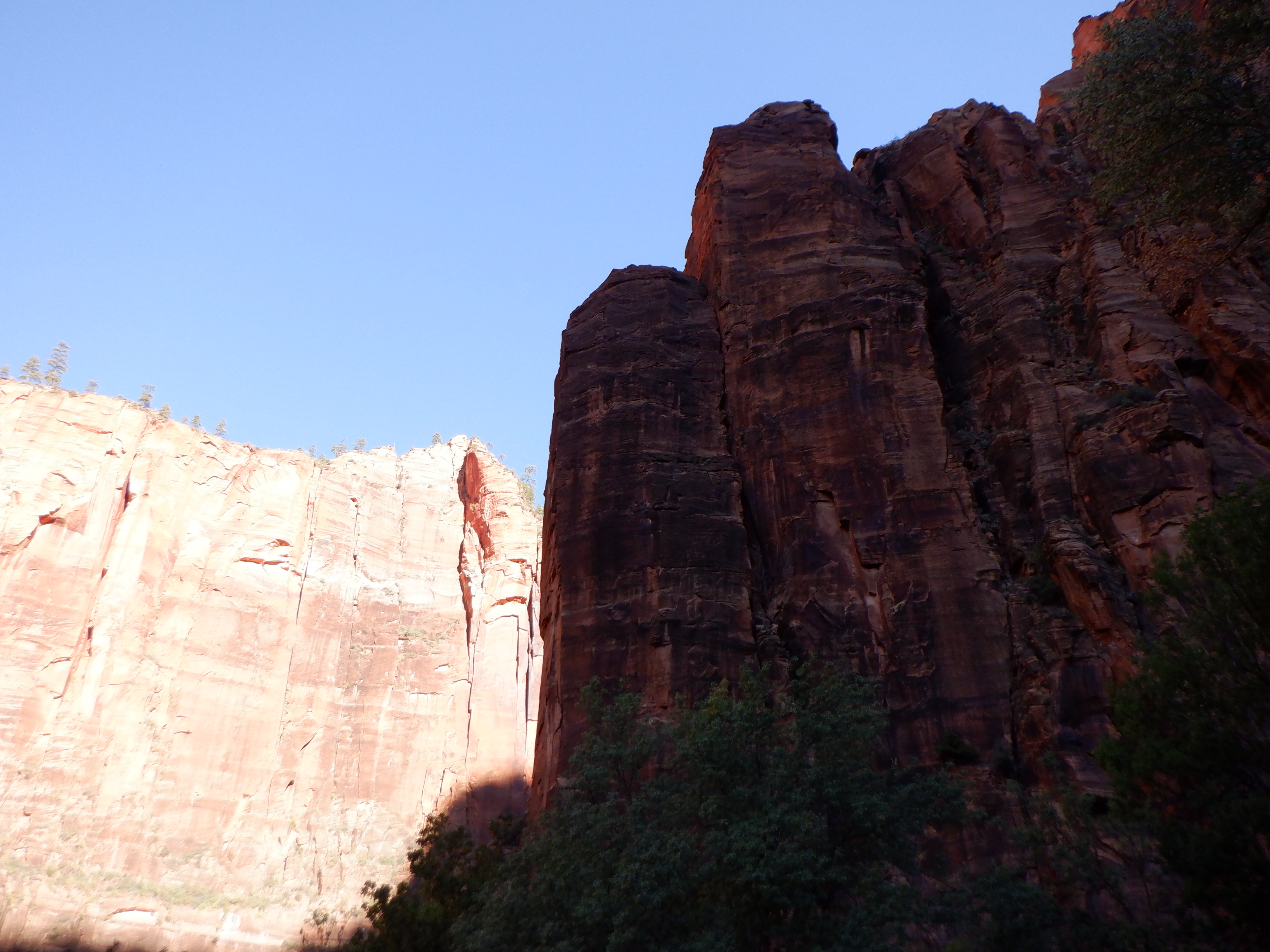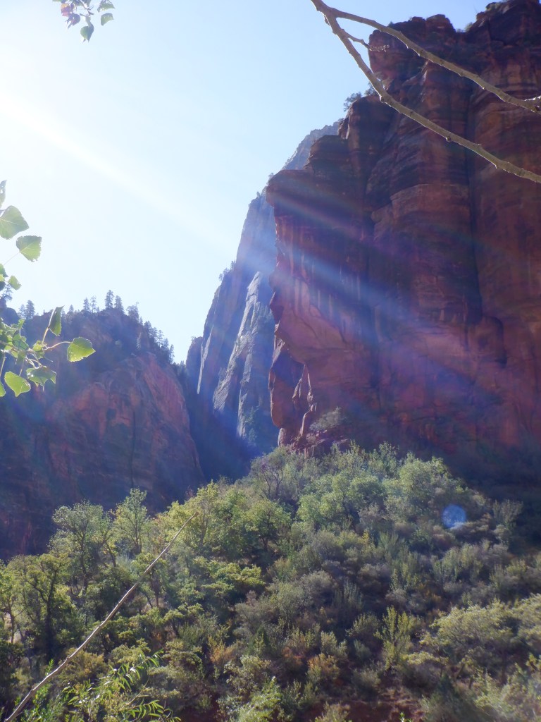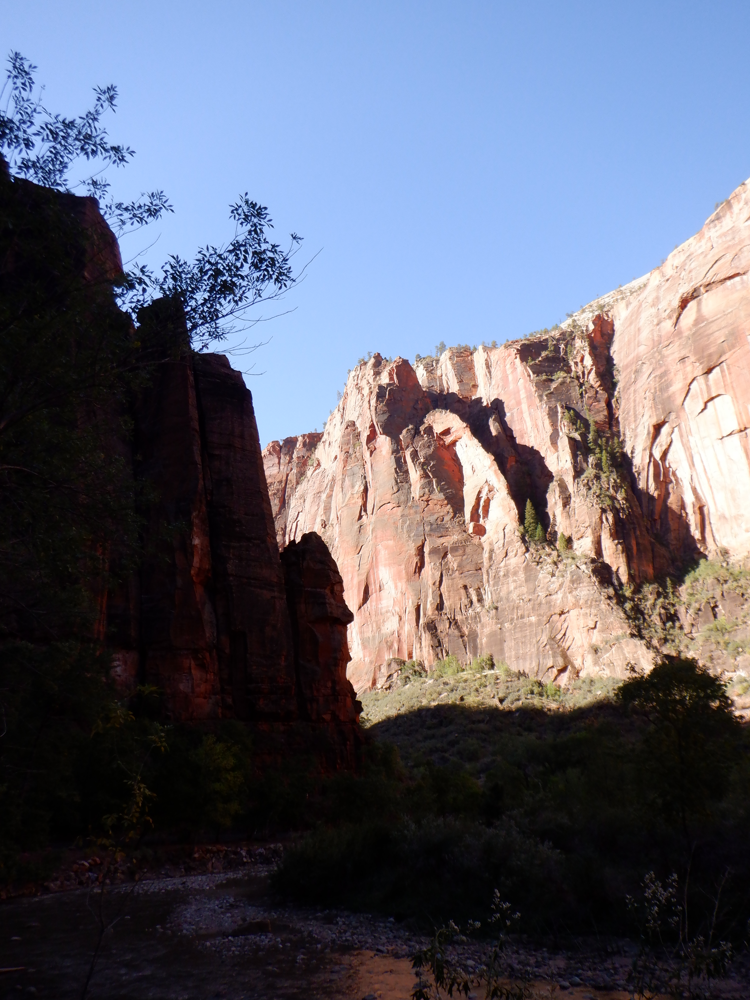 Som sagt som gjort og snart havde vi verden til os selv. Her er canyonen snæver og klipperne lodrette. Stenene er fantastisk røde og rejser sig flere hundred meter over vores hoveder. Vandet risler over små fos i floden ved siden af os. Firben løber ind under buskene og gemmer sig når vi kommer trampene. Chipmunks fiser frem og tilbage i deres evige travlhed.