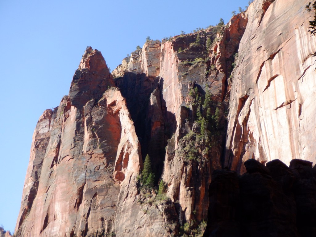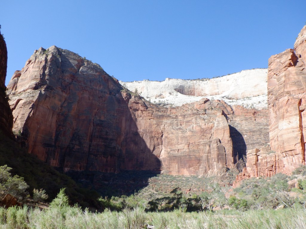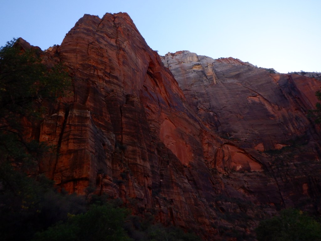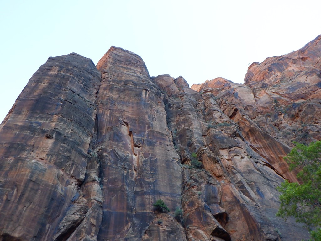 Som sagt som gjort og snart havde vi verden til os selv. Her er canyonen snæver og klipperne lodrette. Stenene er fantastisk røde og rejser sig flere hundred meter over vores hoveder. Vandet risler over små fos i floden ved siden af os. Firben løber ind under buskene og gemmer sig når vi kommer trampene. Chipmunks fiser frem og tilbage i deres evige travlhed.