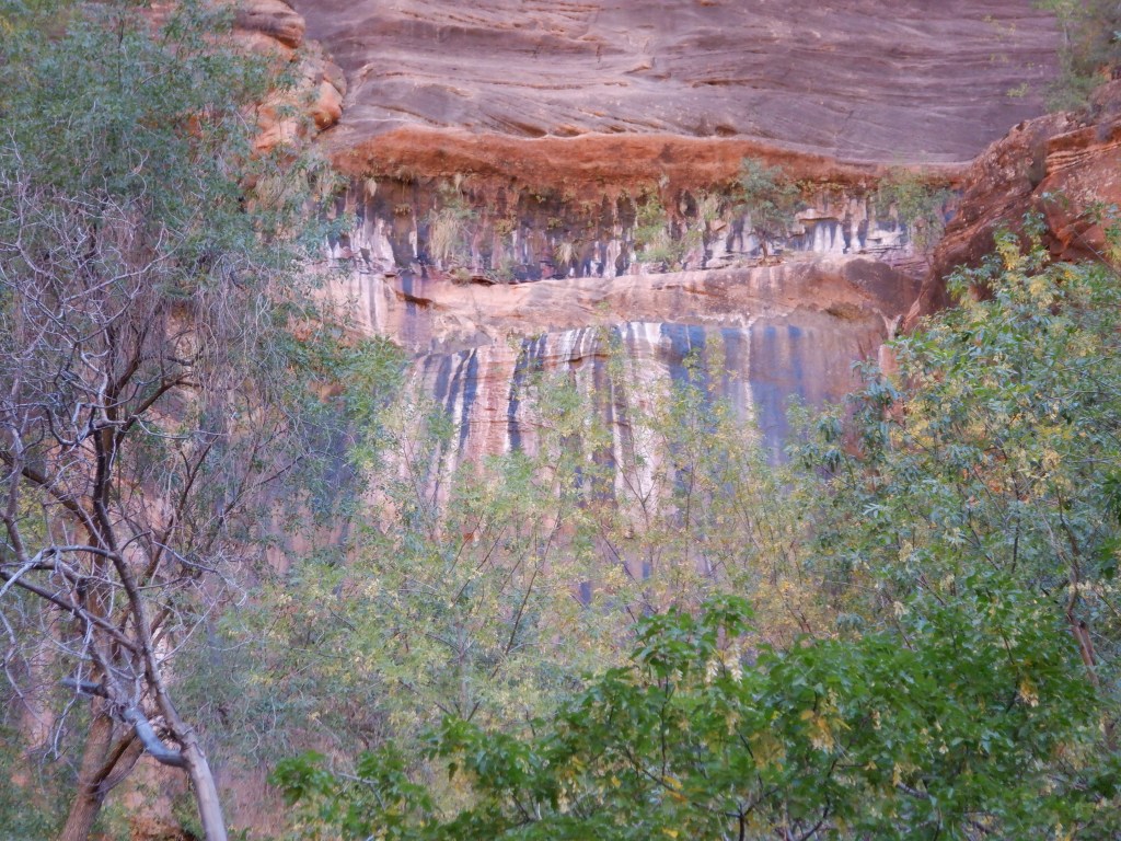 Vi ser en af de kendte ”weeping springs”, altså kildevand der siver ud gennem en sprække i klippen. Her har den efterladt farverige striber ned af klippen. Vidunderligt.