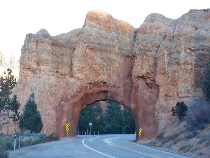 Hvor om alting er – så bliver man målt ved parkens indgang, så Rangeren kan vurdere om trailers og motorhomes kan komme igennem uden problemer. Vi kører ud ad vejen op ad bjerget. Samt endnu mere op ad bjerget – vejen bliver smallere og der er meget trafik – vi er ikke de eneste der skal ud af østsiden af parken. Landskabet her fejler intet – vi belønnes for denne køretur med det ene ”aha” efter det andet. Pludseligt standser trafikken og vi sidder i kø. Der er kø fordi hver gang der kommer et køretøj som Caprise, da de kun kan lade trafikken køre ensrettet gennem tunnelen. Vi venter og snart bliver det vores tur. Som vi nærmer os tunnelen ser vi en ranger der står ved siden af vejen. Hun vinker for os at standse og fortæller så, at vi skal køre midt på vejen – ikke noget med at køre i den ene eller den anden vejbane – ”hold jer midt i indtil i er helt ude af den anden side”. Nu har vi ingen ønske om at flå hele toppen af vores hjem så vejens midterstribe forbliver solidt plantet midt i Caprises kørsel, mens modkørende på den anden side af tunnelen må vente til vi er igennem.
