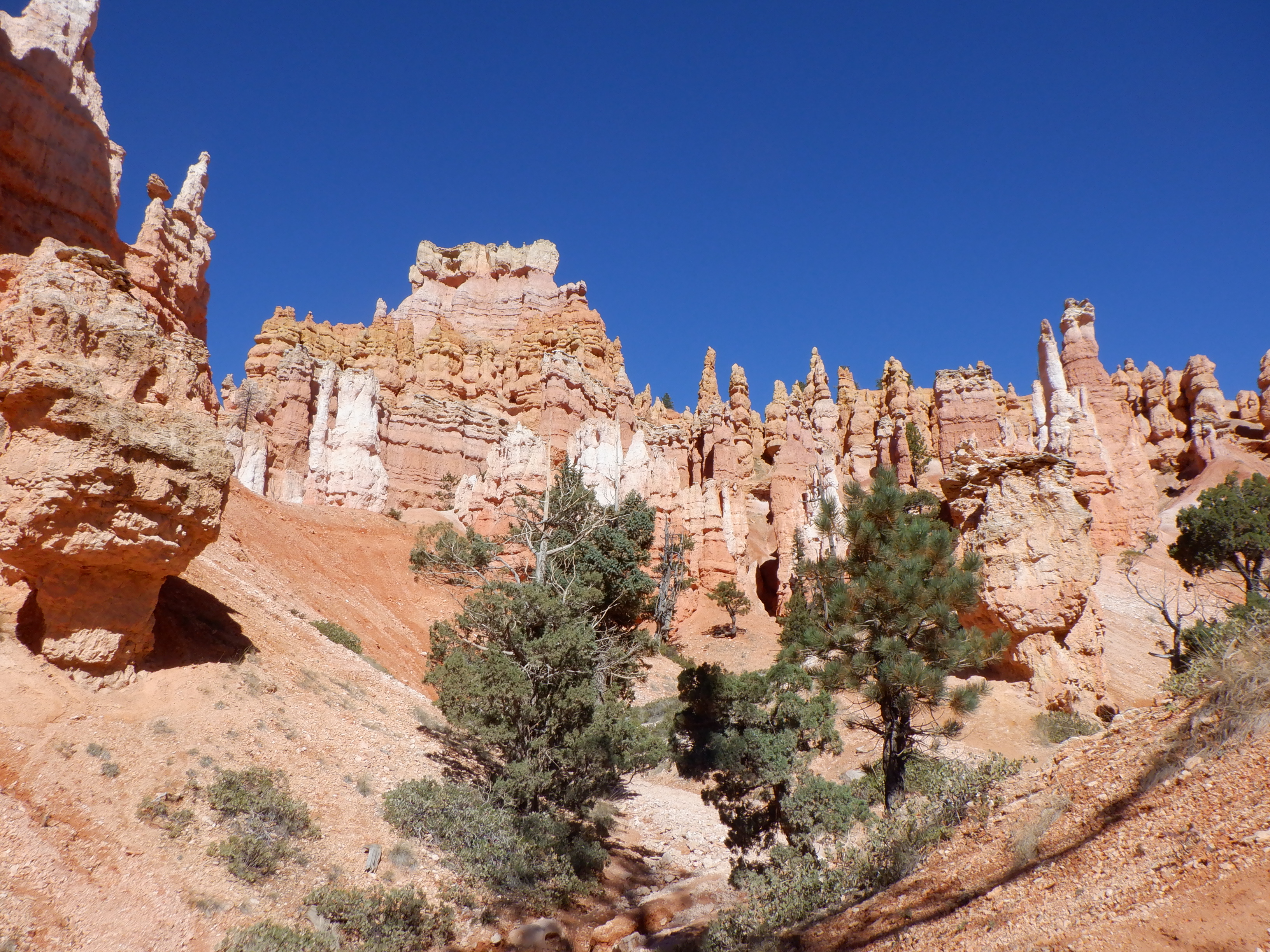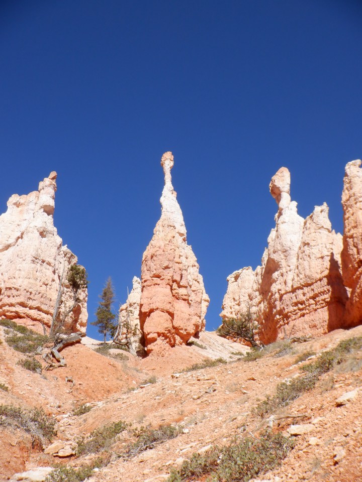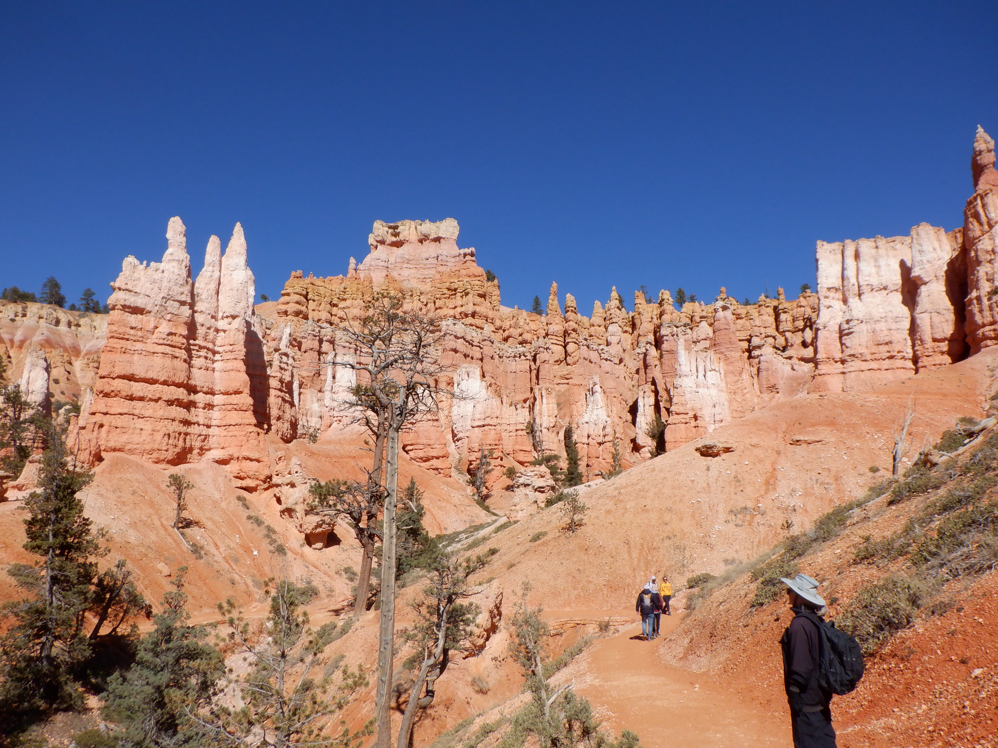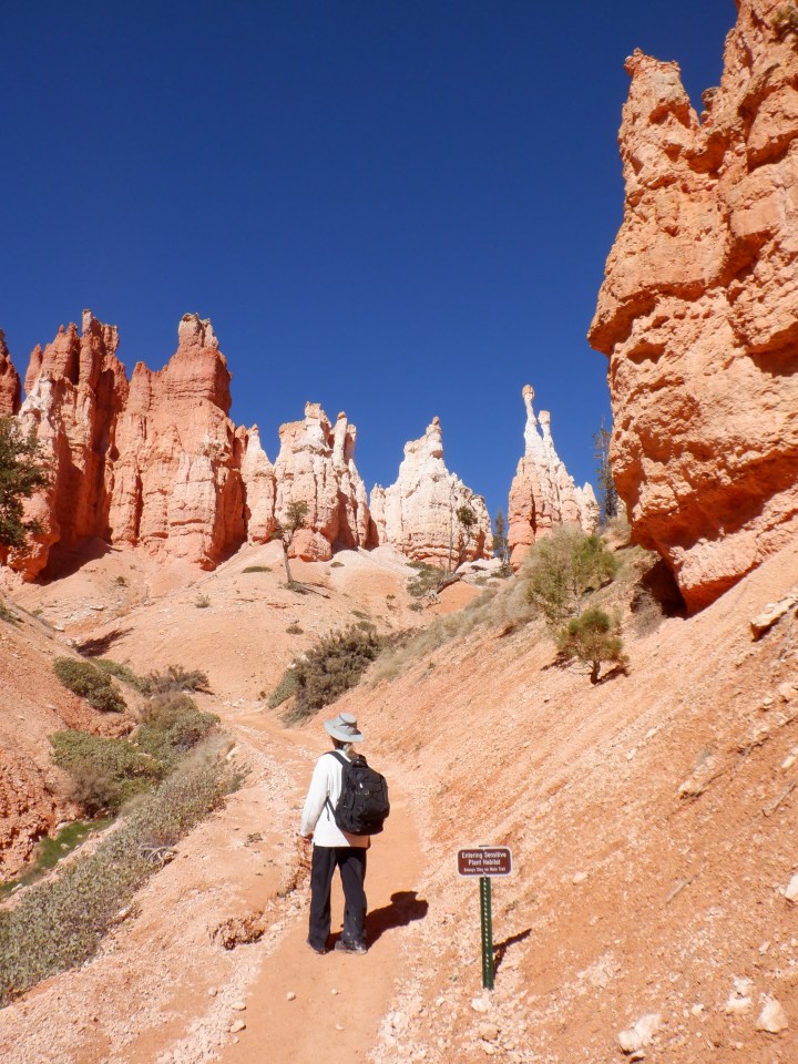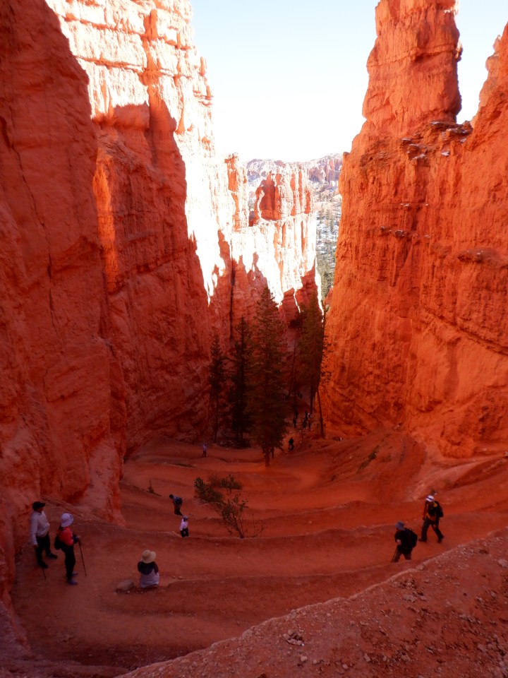 Vinni og jeg starter ned ad Queens Garden Trail. En rundtur skulle være cirka 3-4 kilometer. Ved bunden møder den Navajo Trail og har man lyst kan man tage den op. Turen ned går fint, vi bliver lidt stakåndet et par gange da stien ikke udelukkende går nedad, den går også opad, men vi har fint. Stenformationerne er ubeskrivelige. Vi holder op med at sige ”aha”. Det nytter jo ikke noget. Selv om vi er tidligt på den, er der mange mennesker på denne sti. Vi får slet ikke den samme fornemmelse af at være alene i verden som vi havde i Canyonlands.