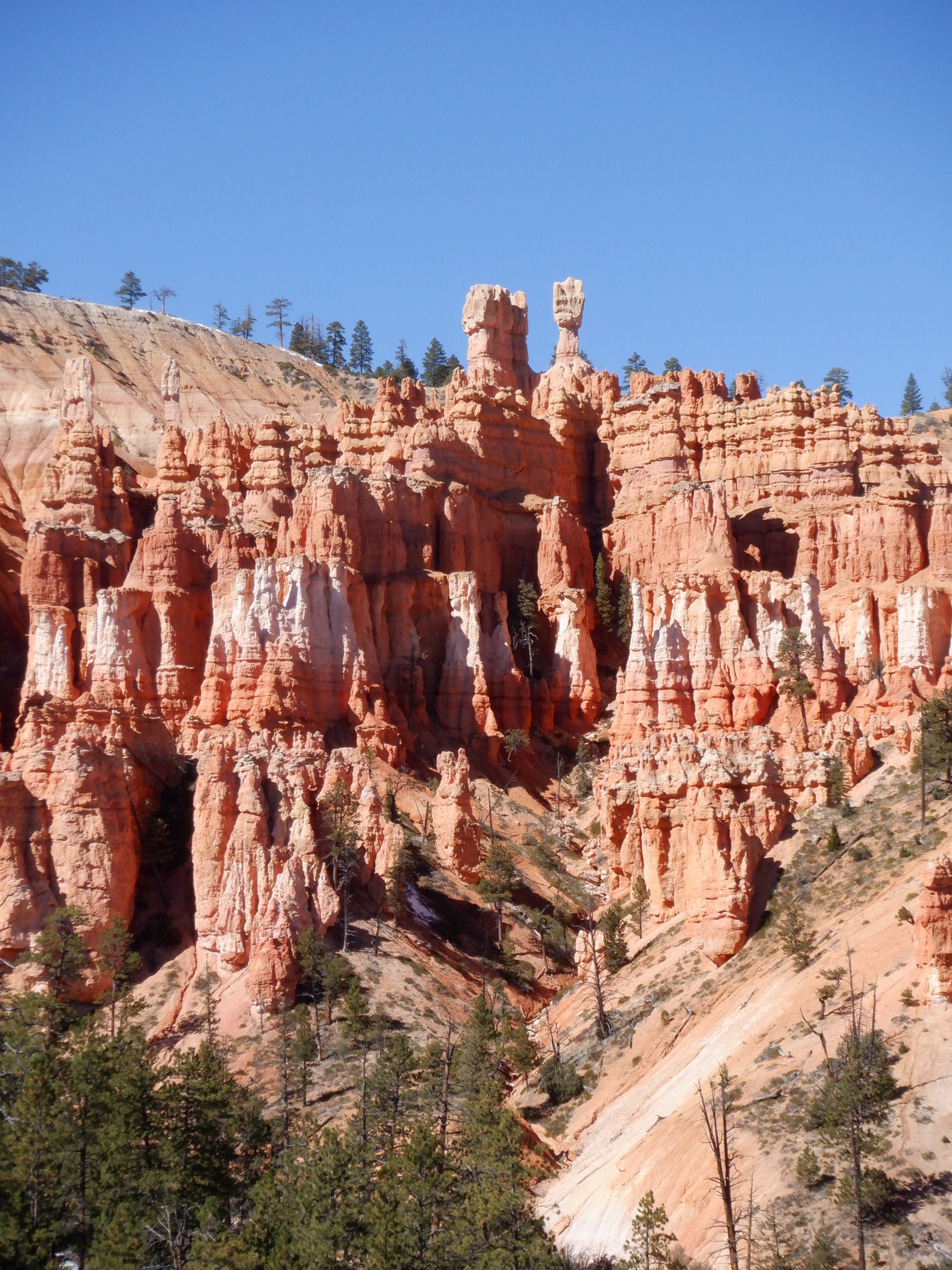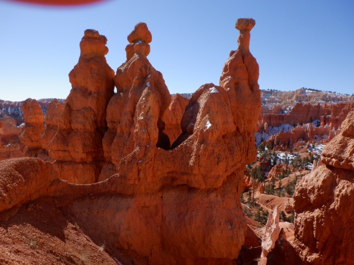 Det første stykke var en dejlig vandring i bunden af canyonen inde i skoven. Efter et par hundrede meter, skilte stien sig og vi tog den til højre (for at går mod uret). Nu begyndte den at stige, så klatrede den videre op ad og den blev bare ved, stejlere og stejlere. Rundt om os rejste ”Hoodoo’erne” sig. Hoodooer er navnet på disse utrolige stenspir der rejser sig overalt her. Stien bliver meget stejl. Her er der mange steder hvor solen ikke når og der ligger sne og is. Stien er smal og laver mange hårnåle sving. Der er laaaangt ned. Vi hiver efter vejret. Vi er trods alt i over 2,5 kilometers højde. Luften er meget tynd og vi er slet ikke vant til dette. Vi holder jævnligt pause for at puste ud. Selv med pauser begynder vi at føle det i vores ben. Den tynde luft og vores mangel på at indtage nok ild gør at musklerne heller ikke får nok ilt. Vi puster og stønner noget mere. Jeg mere end Vinni, men hun føler det også. Vi møder få andre her (ingen andre er vel tosset nok til at gøre dette). Dem vi møder er også stakåndet. Ingen slipper.