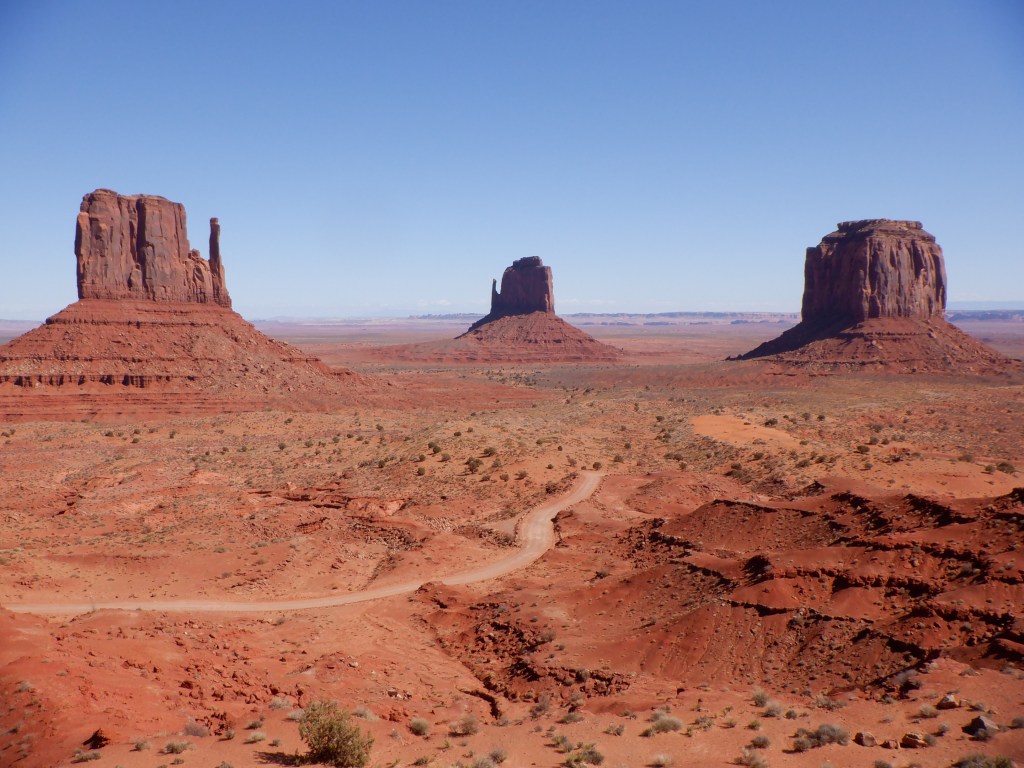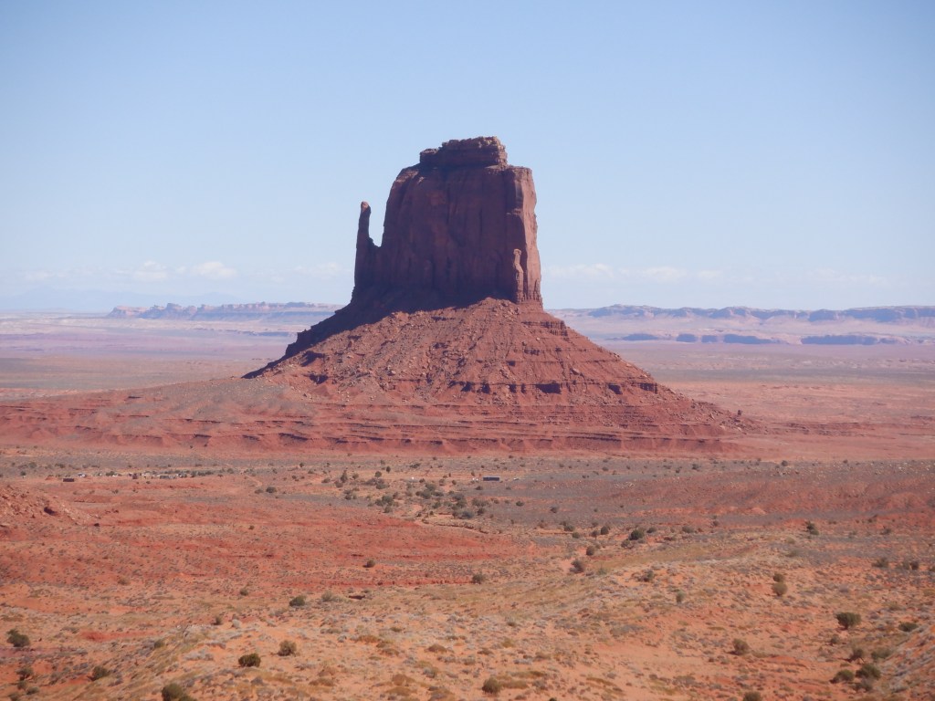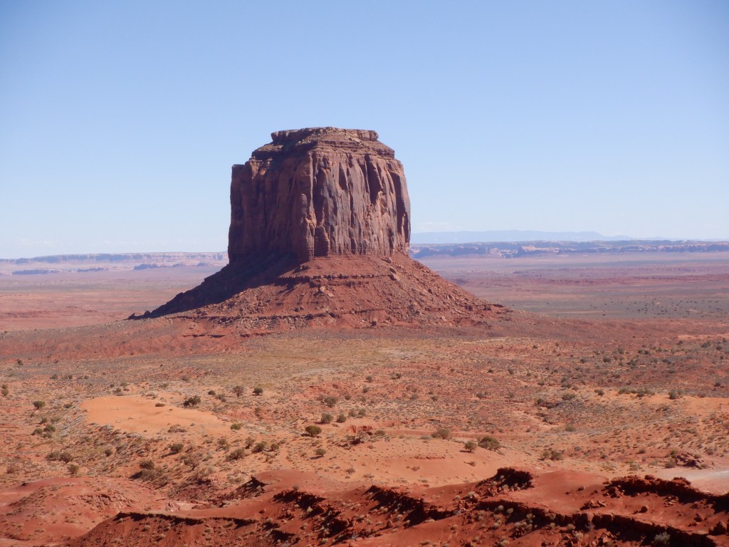Disse fladtoppede bjergformationer kalder man her ”Butte” og ikke ”Mesa”. En Mesa er bredere end den er høj eks. Mesa Verde (beskrevet i en tidligere beretning), og en Butte er højere end den er bred. De højeste af disse buttes, vi står og betragter, er omkring 300m høje. Den flade bjergtop er skabt af vinden, men resten af bjergets form er skabt ved korrosion. Bjergets øverste lag består af et relativt hårdt stenmateriale, mens resten af bjerget består af mere porøst sandsten, der skylles væk af regnvandet. Over millioner af år skaber vind og regn disse hatte-lignende bjerge i Monument Valley. Den røde farve skyldes det meget jernholdige materiale.