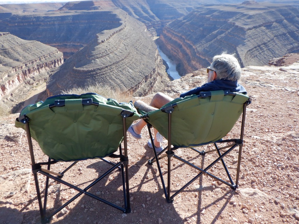 Vi må videre og kører ca. 60 km ud til Gooseneck State Park for at campere her. Endnu et gensyn fra 1991, hvor vi kørte ud til denne park, men denne gang har vi valgt at campere her i stilhed og med kun få campister. Vi finder en plads helt ude ved kanten af plateauet og får en mageløs bjergtagende udsigt ud over kløften/kløfterne, der snor sig som en ”gåsehals”, deraf navnet Gooseneck. Vi bliver her i to dage og går ture langs klippekanterne.