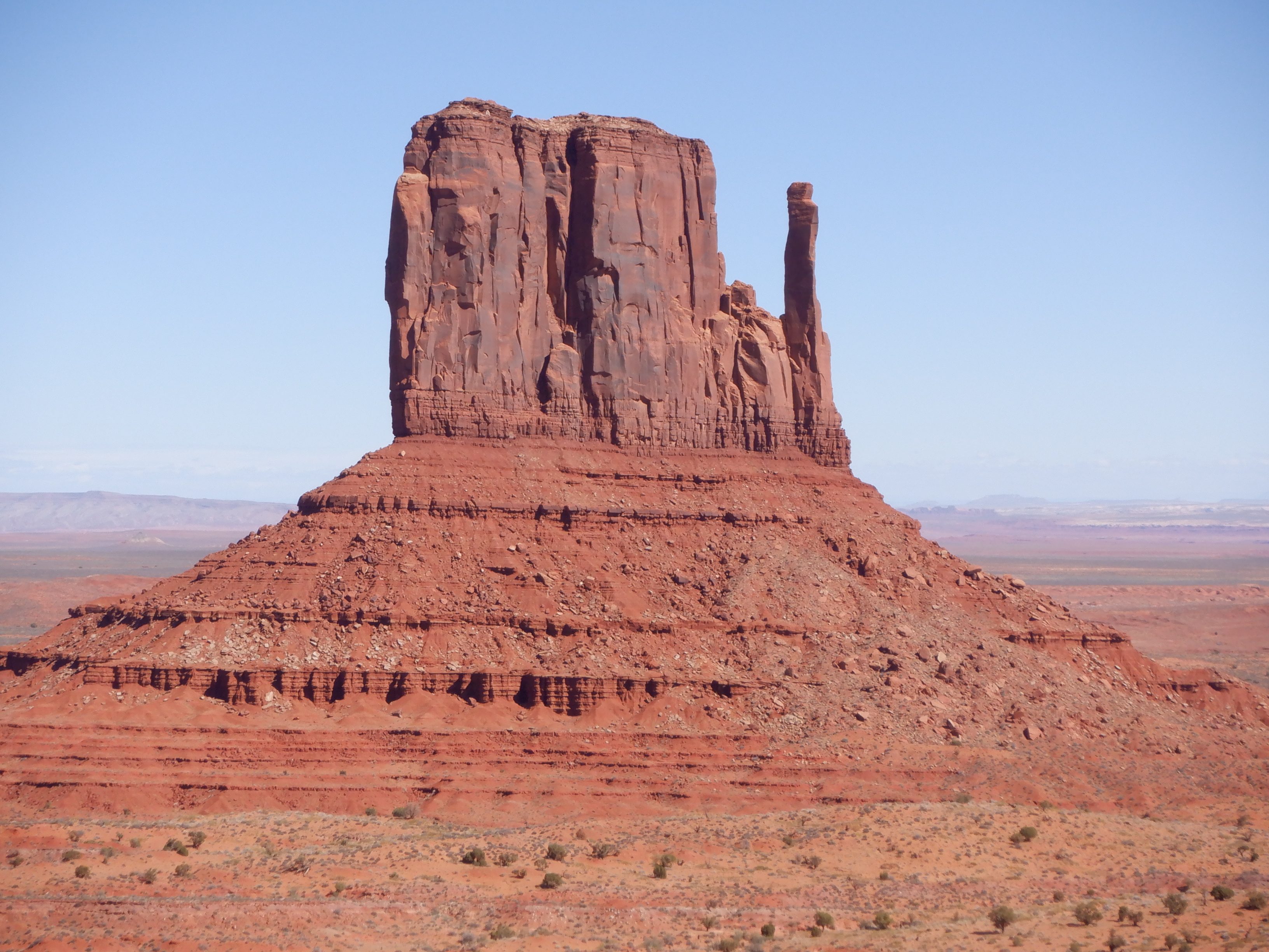 Disse fladtoppede bjergformationer kalder man her ”Butte” og ikke ”Mesa”. En Mesa er bredere end den er høj eks. Mesa Verde (beskrevet i en tidligere beretning), og en Butte er højere end den er bred. De højeste af disse buttes, vi står og betragter, er omkring 300m høje. Den flade bjergtop er skabt af vinden, men resten af bjergets form er skabt ved korrosion. Bjergets øverste lag består af et relativt hårdt stenmateriale, mens resten af bjerget består af mere porøst sandsten, der skylles væk af regnvandet. Over millioner af år skaber vind og regn disse hatte-lignende bjerge i Monument Valley. Den røde farve skyldes det meget jernholdige materiale.