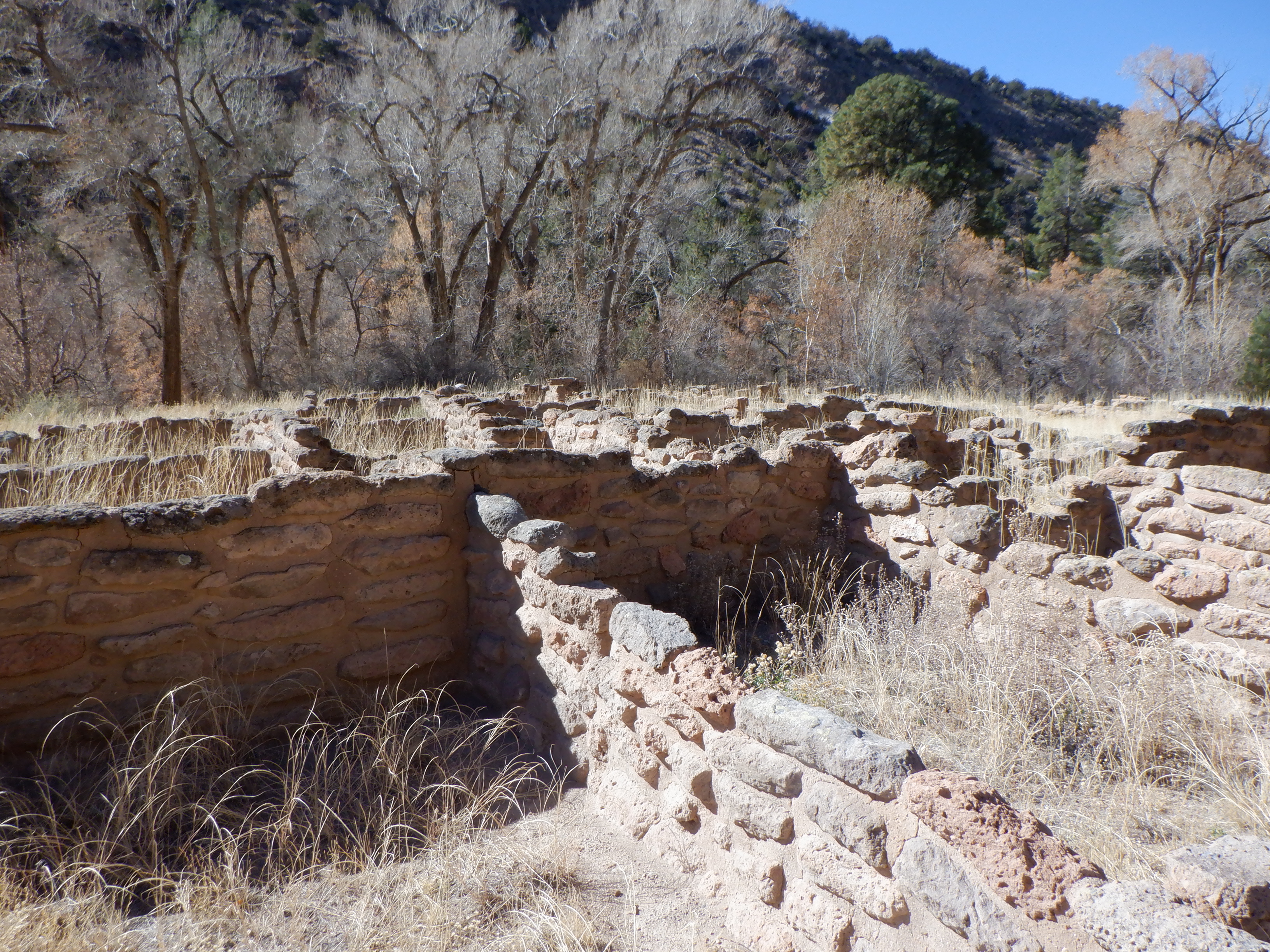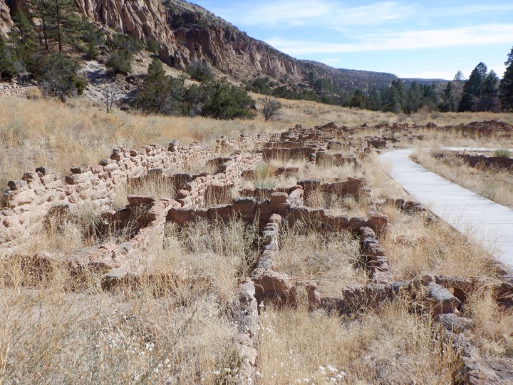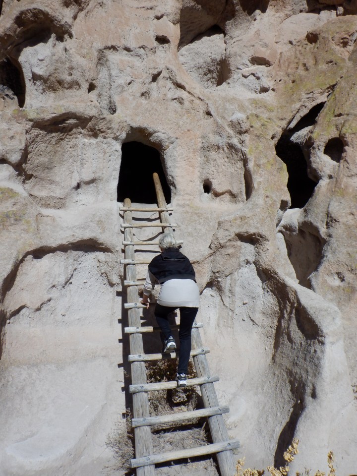 Tilbage i New Mexico. Vi benyttede chancen for at besøge Bandelier National Monument, der ligger i Jemez bjergene lidt syd og vest fra Ulrichs hus. Bandelier er et større område hvor Pueblo Indianerne boede i mange tusind år (vel indtil omkring år tusind). Her byggede de også klippehuse samt udhulede klippen til rum. Der er flere bosteder her i området. Mange af dem er små, de har vel kun husede et par familier, mens andre er meget store og har husede flere end 400 familier.