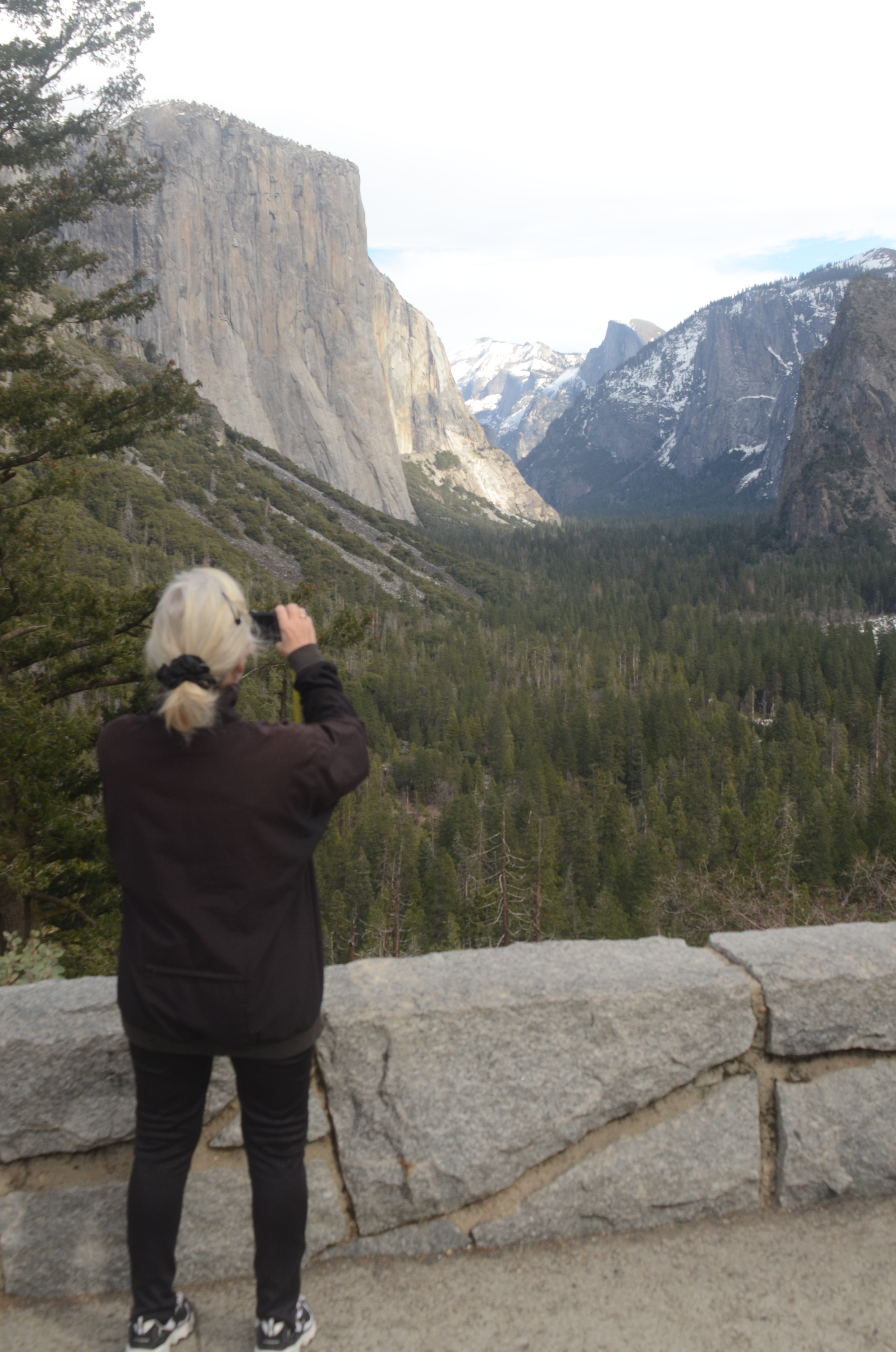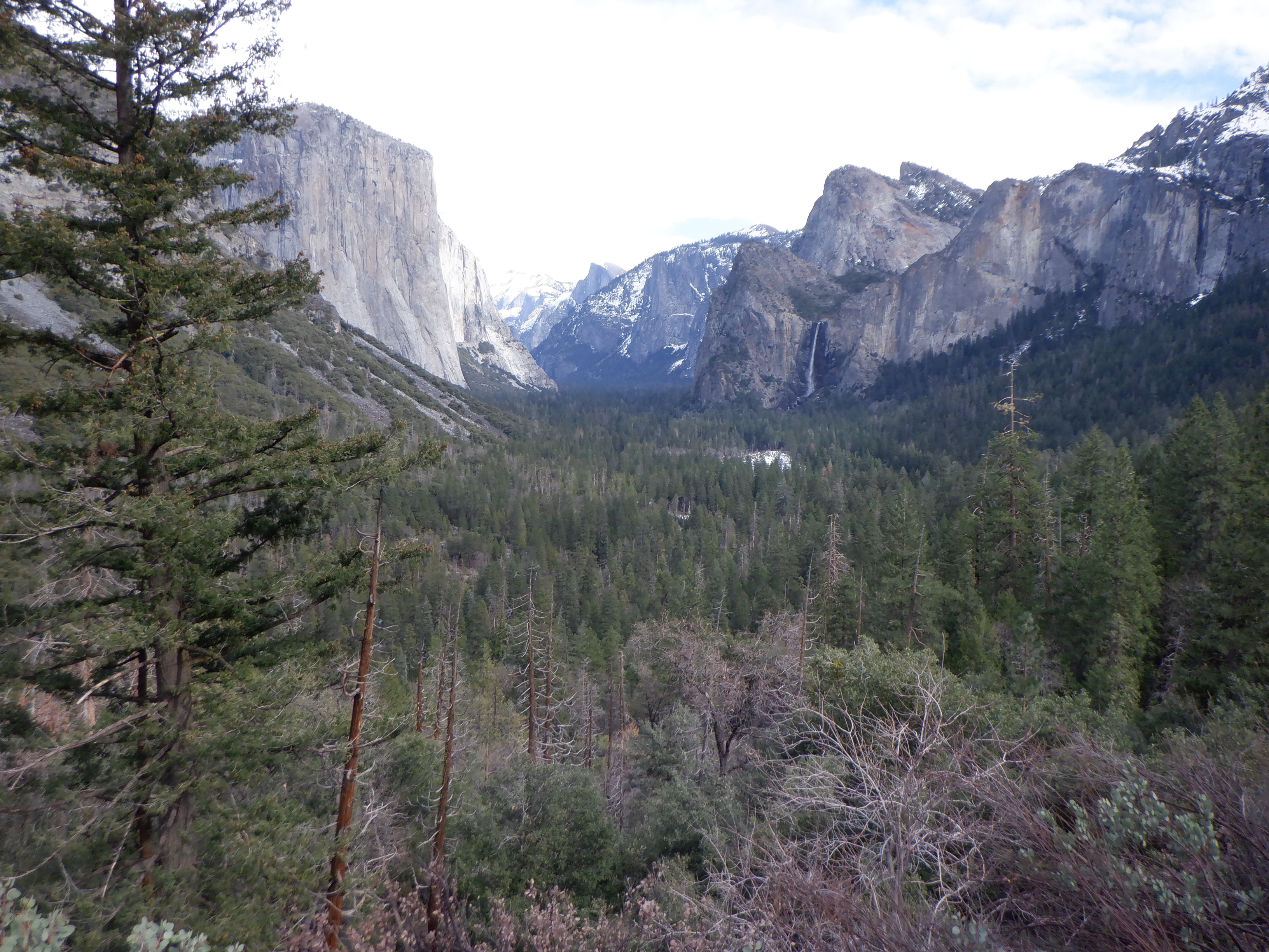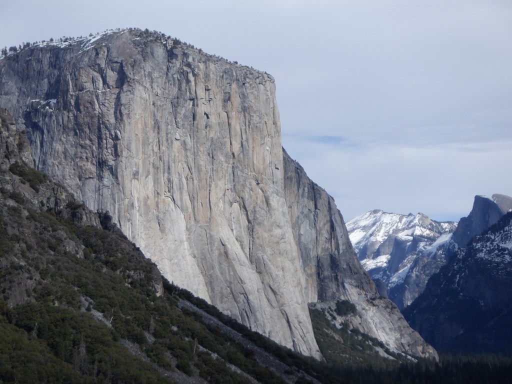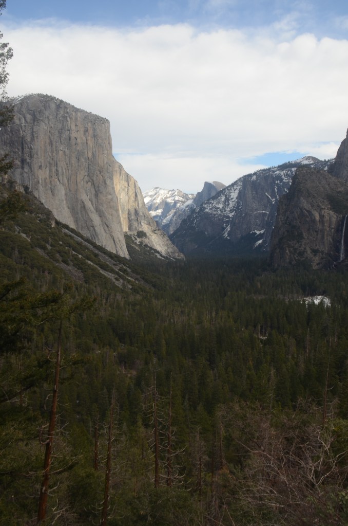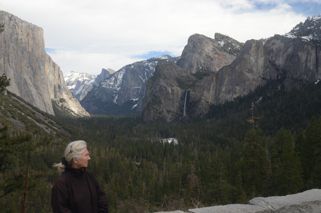 Nede i Yosemite Valley (dalen) findes flere vandrestier i dette smukke naturområde, men det er vinter og her ligger meget sne – vi opgiver vores planer om at vandre og kører hjem ud gennem den vestlige udkørsel og får en betydelig nemmere køretur hjem på 150 km.