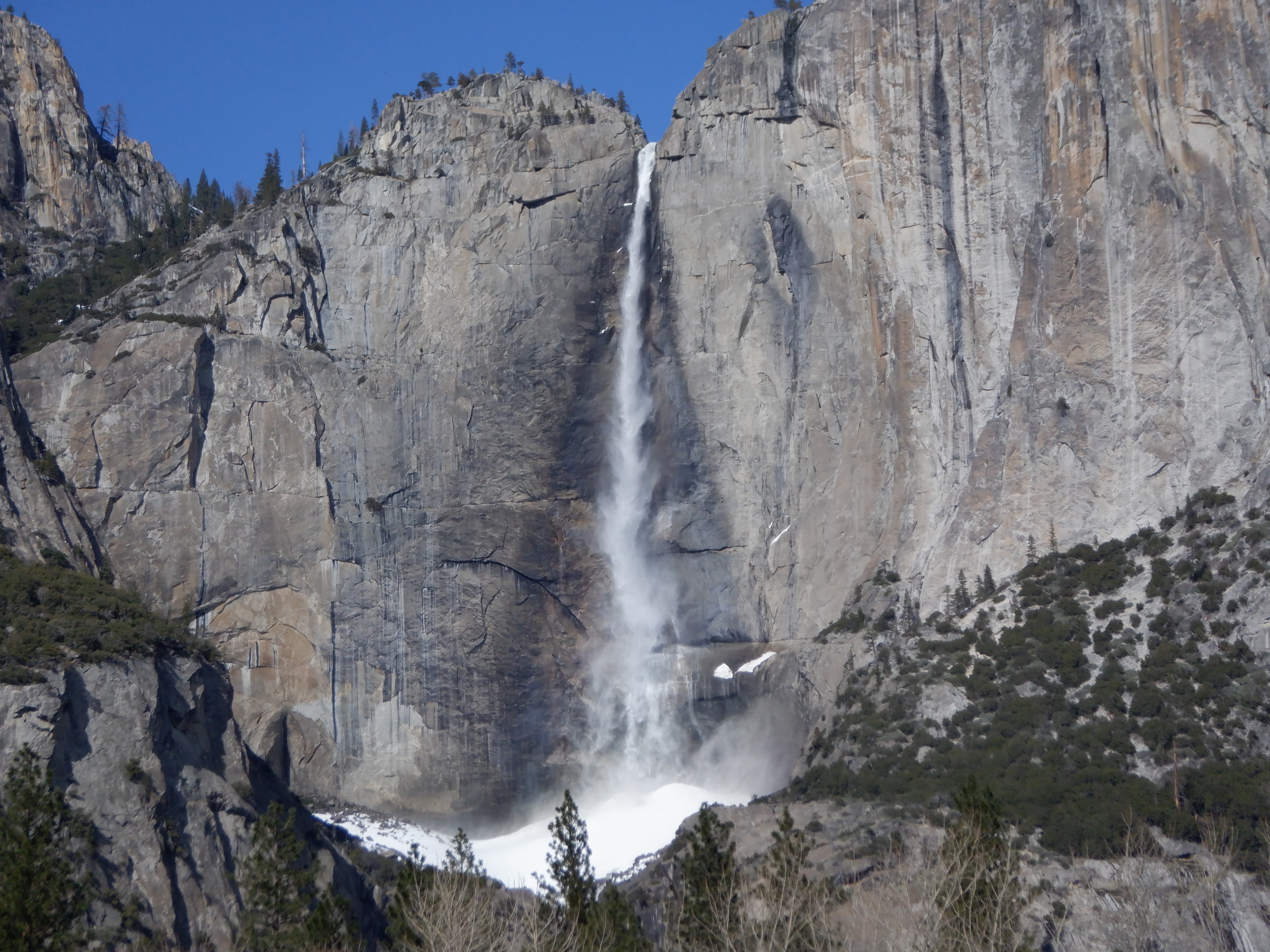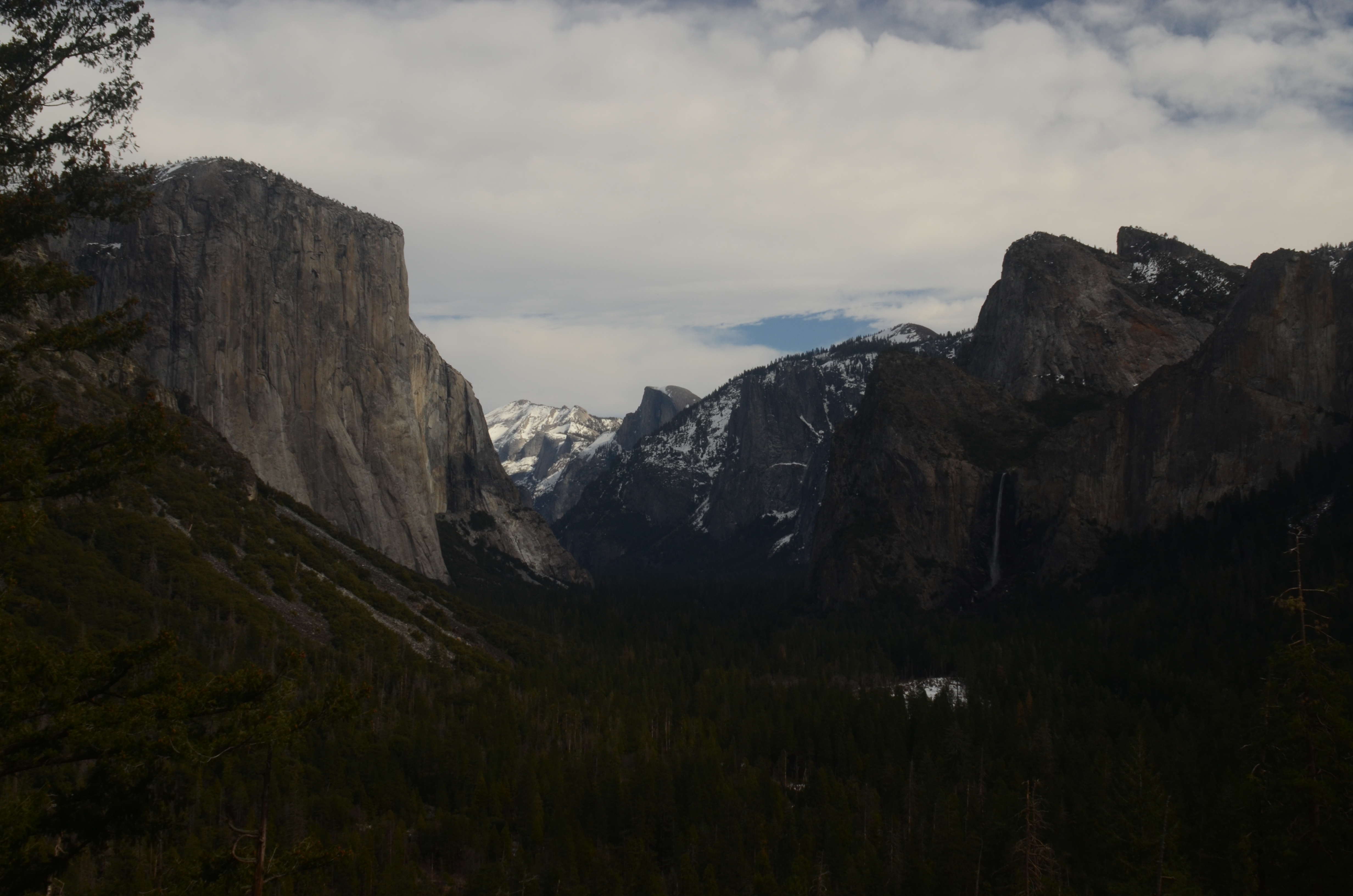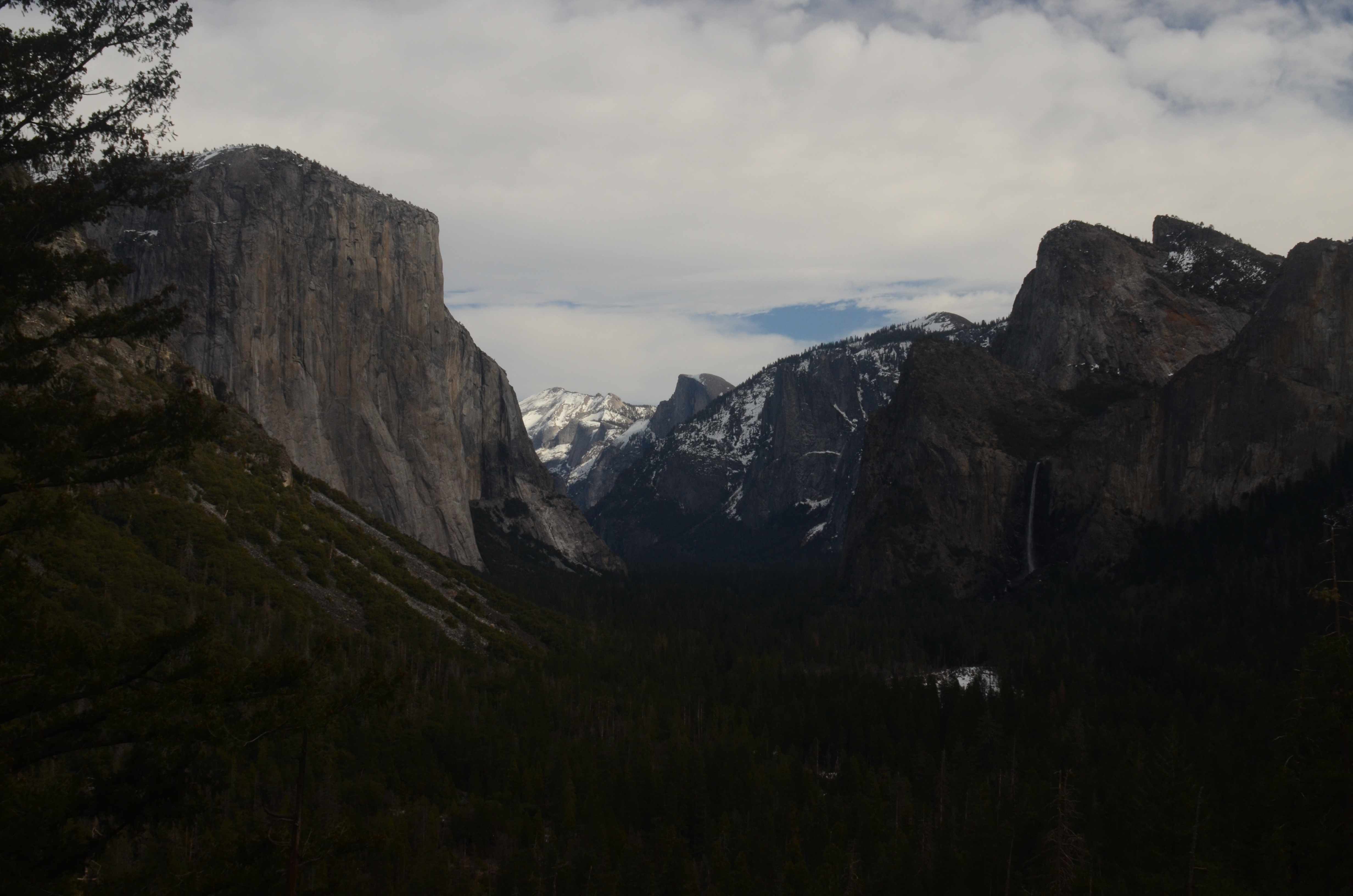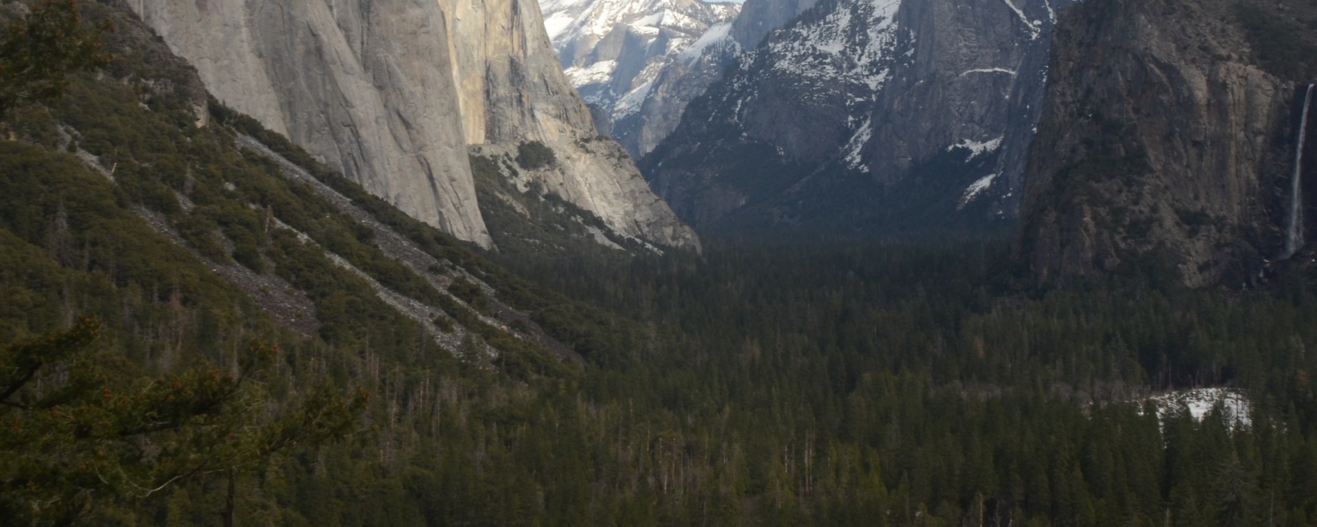 Nede i Yosemite Valley (dalen) findes flere vandrestier i dette smukke naturområde, men det er vinter og her ligger meget sne – vi opgiver vores planer om at vandre og kører hjem ud gennem den vestlige udkørsel og får en betydelig nemmere køretur hjem på 150 km.