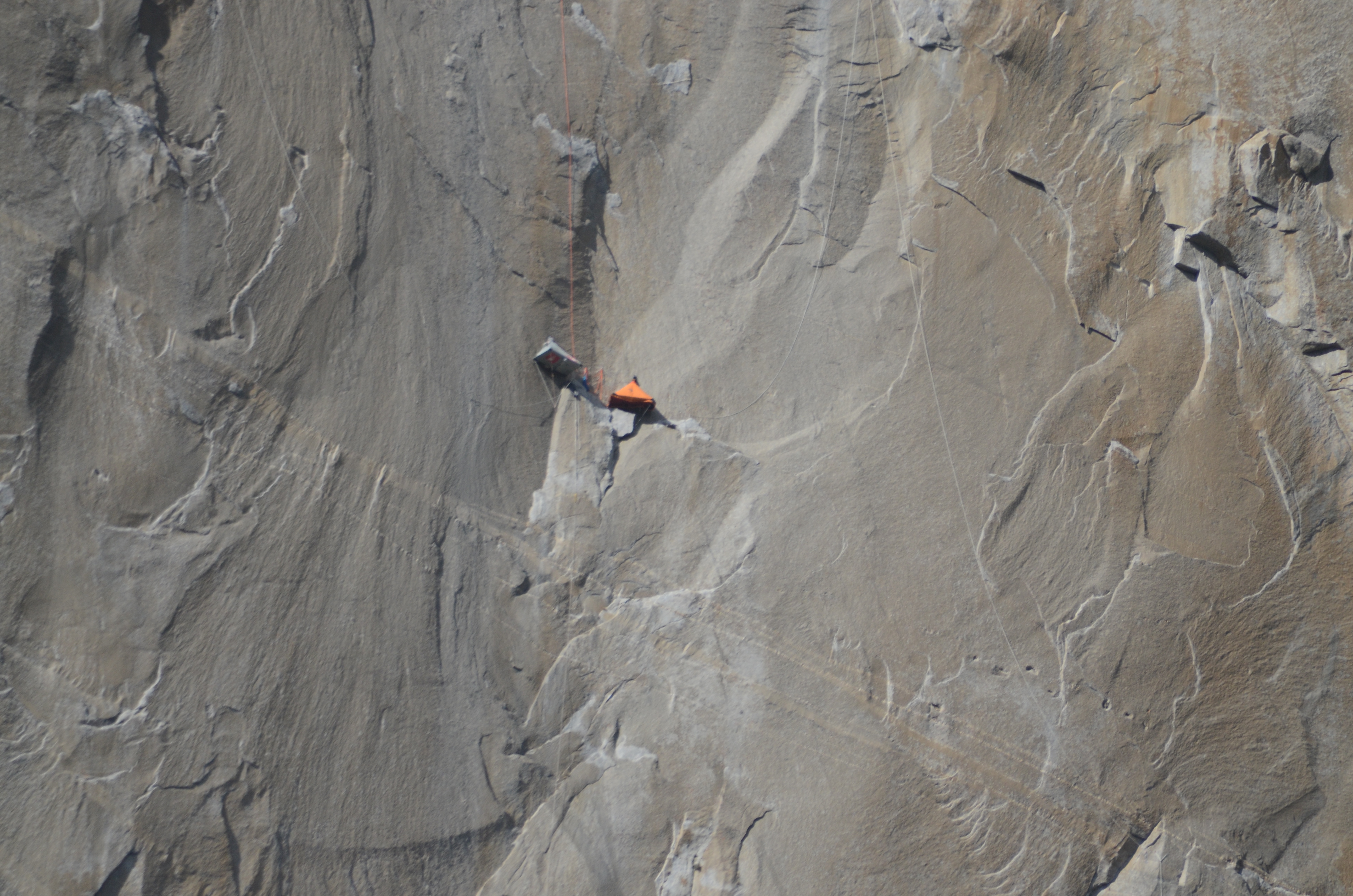 El Capitan kan ikke bestiges på en dag, hvorfor de to bjergbestiger har slået telt op midtvejs for at overnatte her – man må håbe, at de ligger stille, når de sover, og at de har fastgjort sig med seletøj til klippevæggen