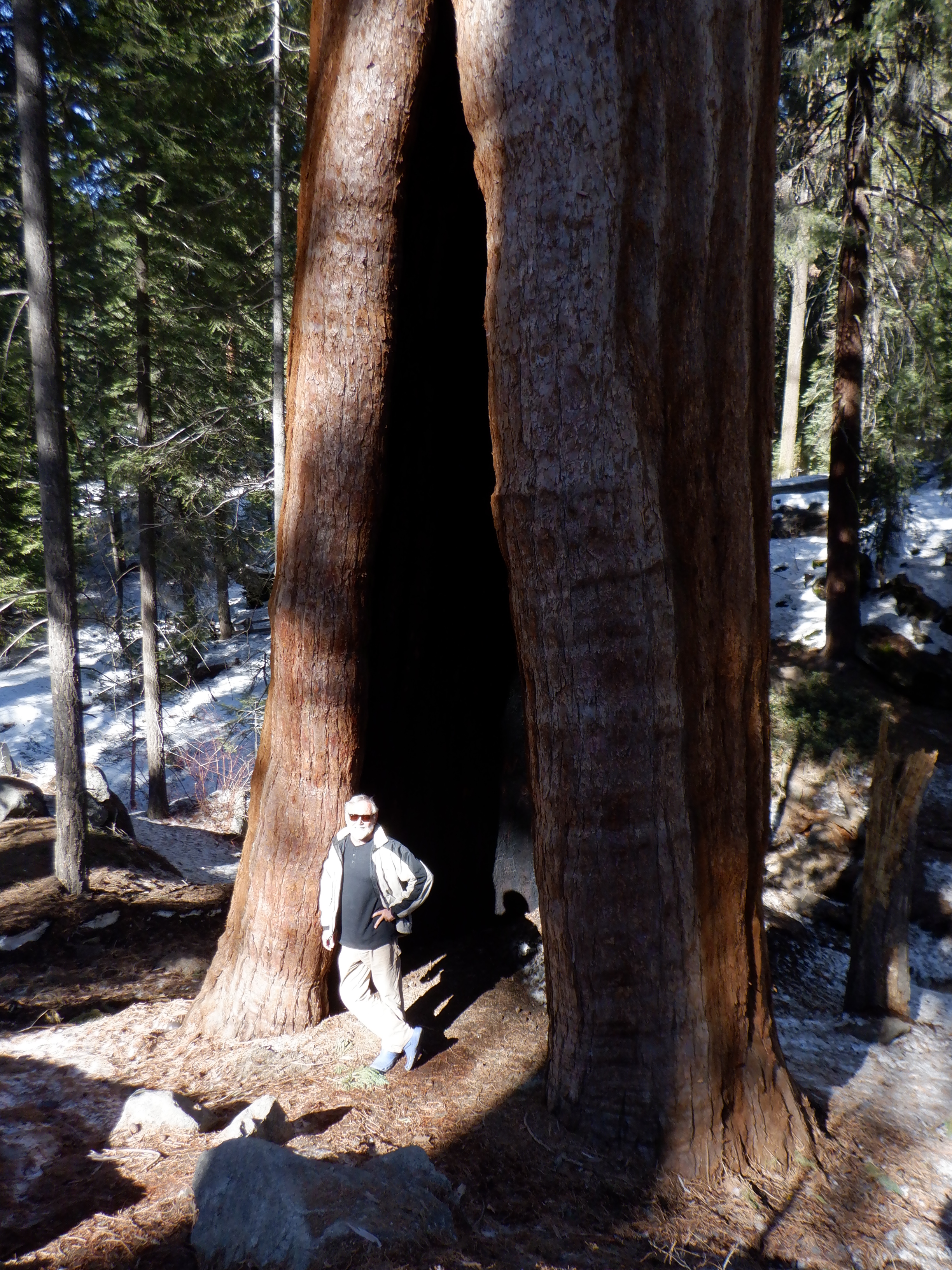 Her får man indtryk af, hvor stor den nederste del af stammen er. Carsten har ingen problemer med at stå inde i stammen, men han var lige ved at sætte sig på rumpen, da han skulle ned til stammen, fordi der ligger sne og is på skovbunden