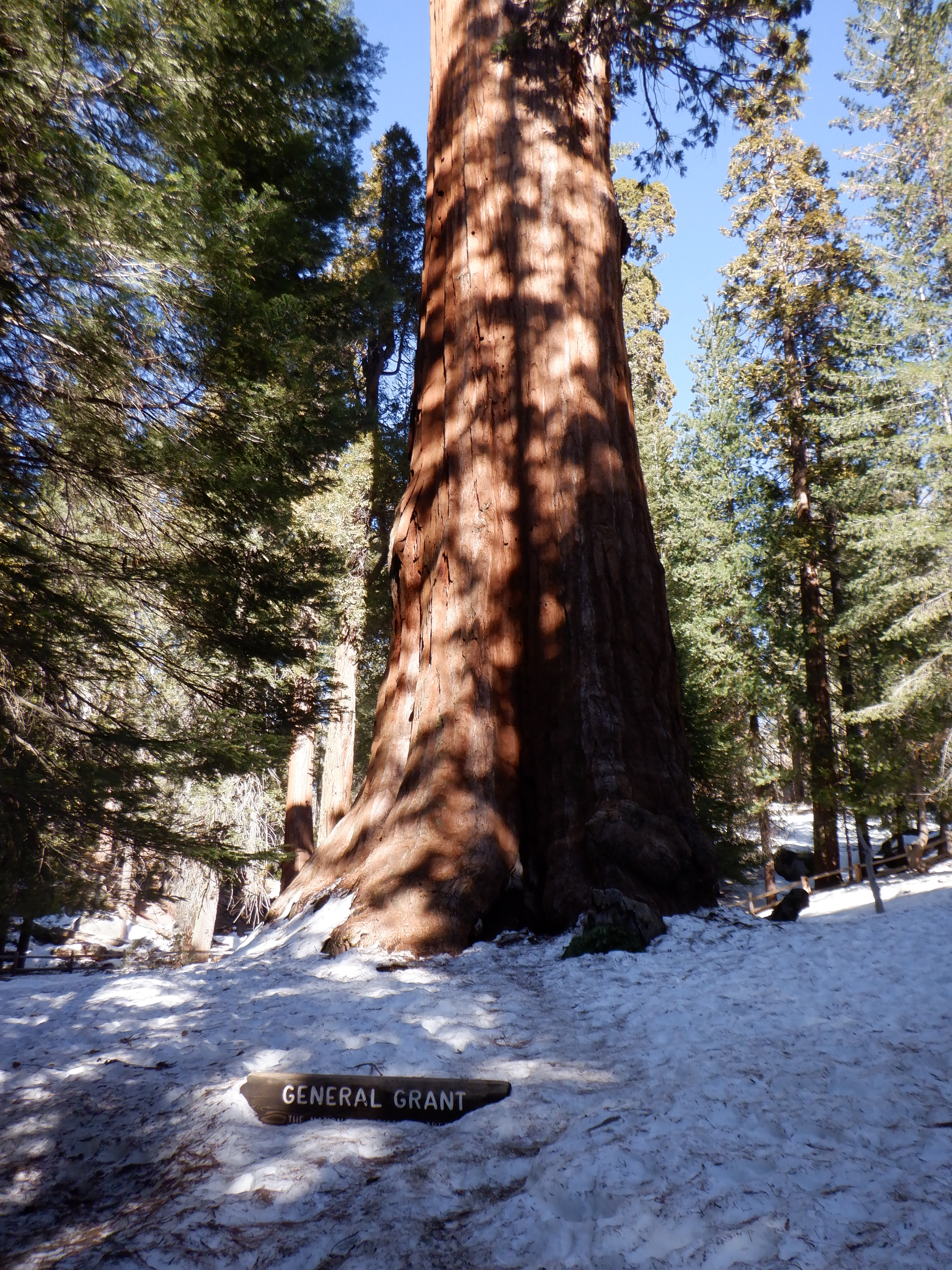 Vi når frem til General Grant, verdens næststørste træ ifølge parkbetjenten, men han må have overdrevet eller husket forkert, for General Grant er ”kun” det tredje største træ målt i volumen.