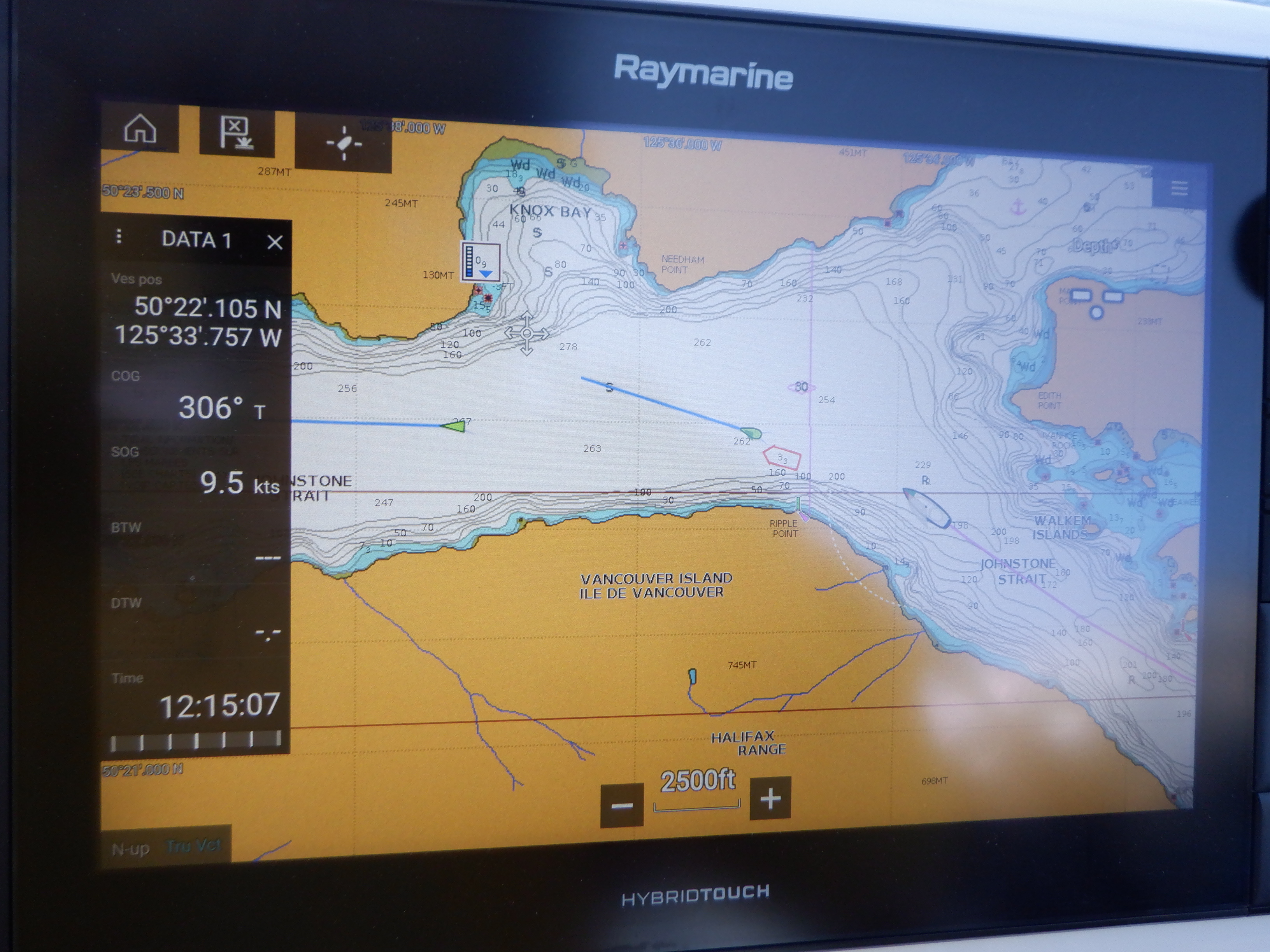Vi får en aldeles udramatisk og behagelig tur gennem Seymour Narrows, fortsætter op gennem Discovery Passage og drejer af til Johnstone Strait, som også er berygtet, da det snævre stræde løber direkte mod nordvest, hvorfra vinden ofte kommer, som en tunnelvind ind gennem strædet. Til stor ubehag for sejlerne. Vi vil helst have medstrøm, da strømmen her kan blive op til 6 knob. Øh, en nordvest gående strøm op mod en nordvesten vind – strøm mod vind – giver altid ubehagelige krapsøer.