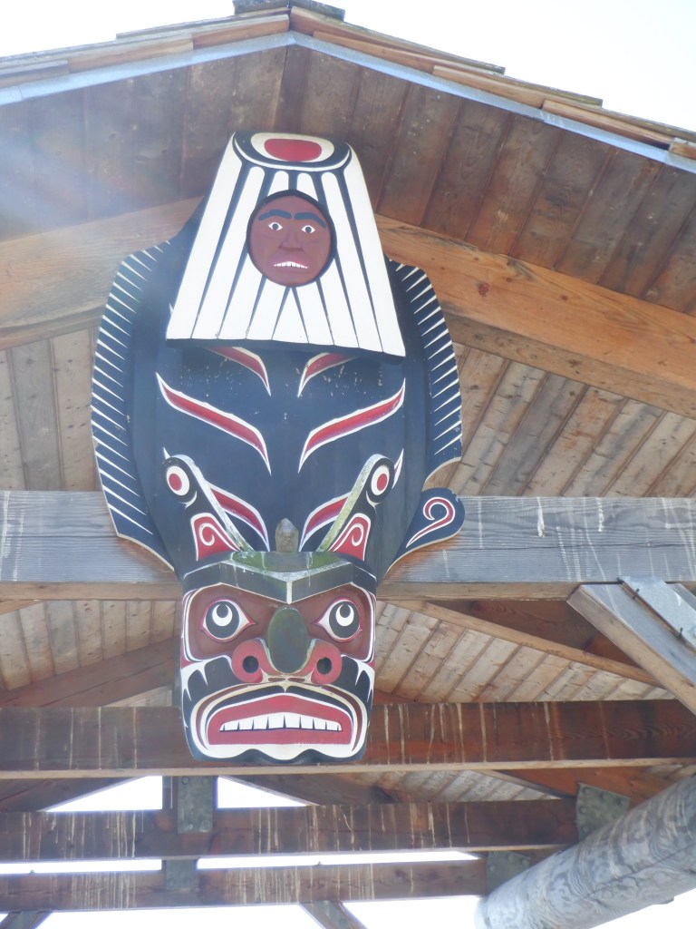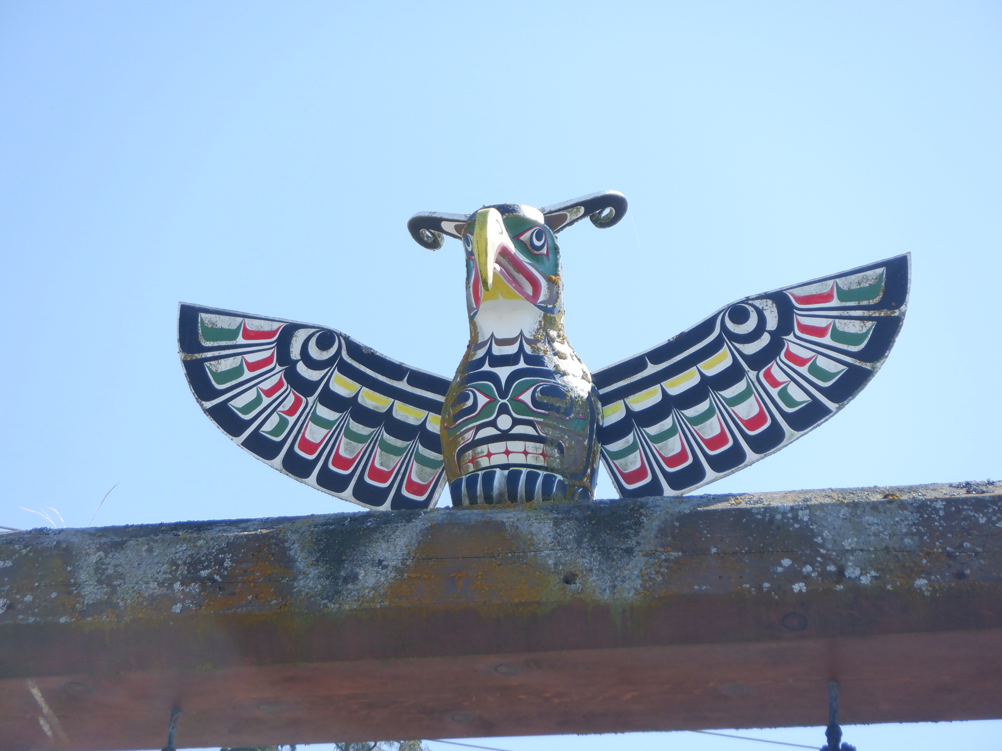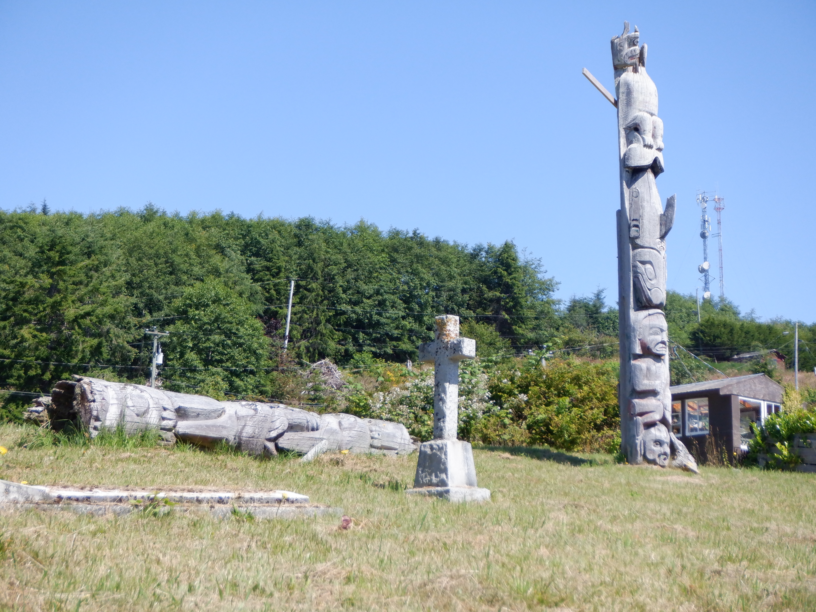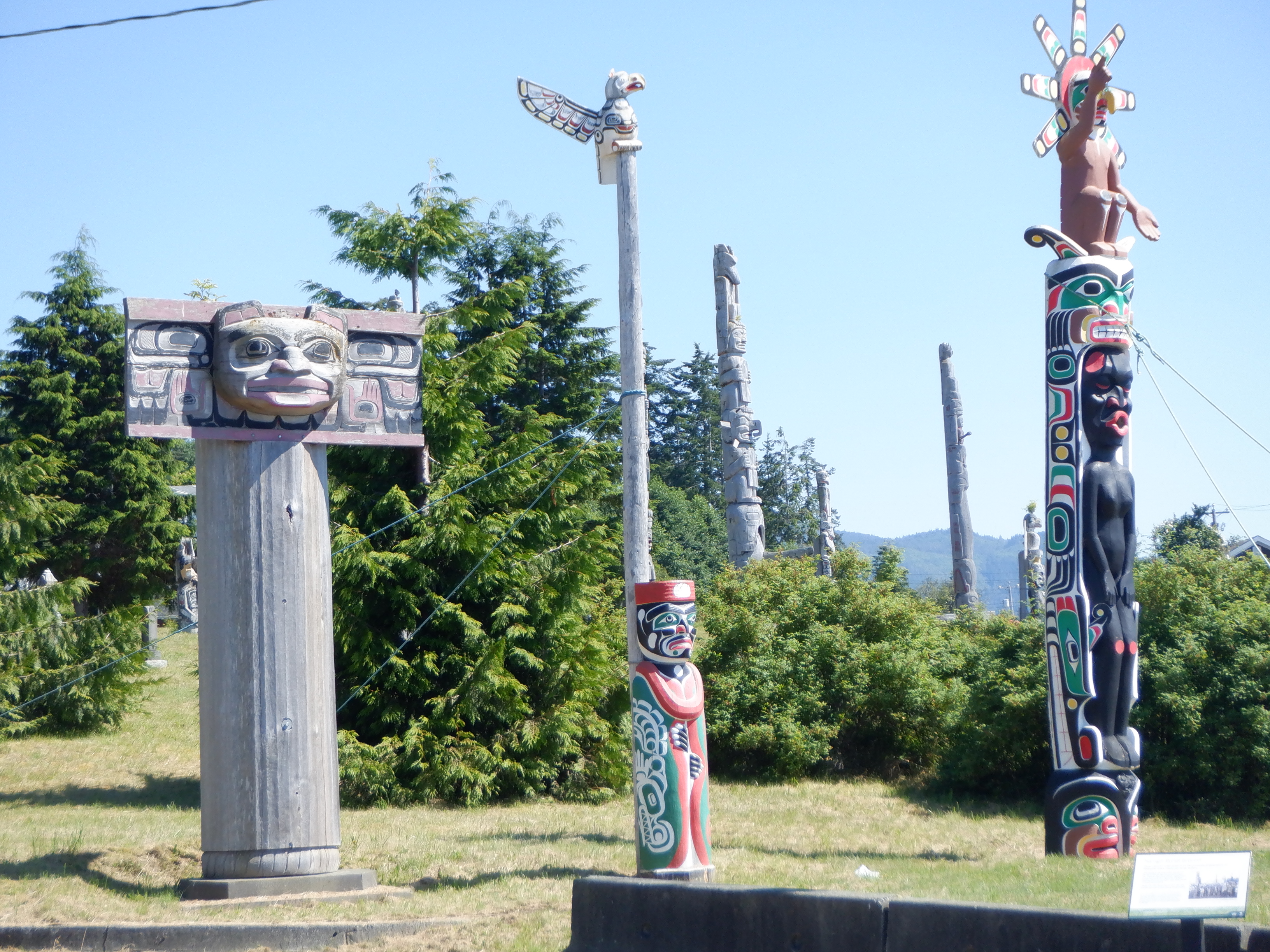 Stammen der bor her (og har altid boede her, hedder ’Namgis. Øen er fyldt med totempæle og der er en tæt koncentration af dem i den originale ’Namgis begravelsesplads. Det er ikke tilladt at entrere begravelsespladsen for ikke ’Namgis. Men vi kunne da stå udenfor og tag billeder af nogle af de mange totempæle, hvilken vi gjorde.