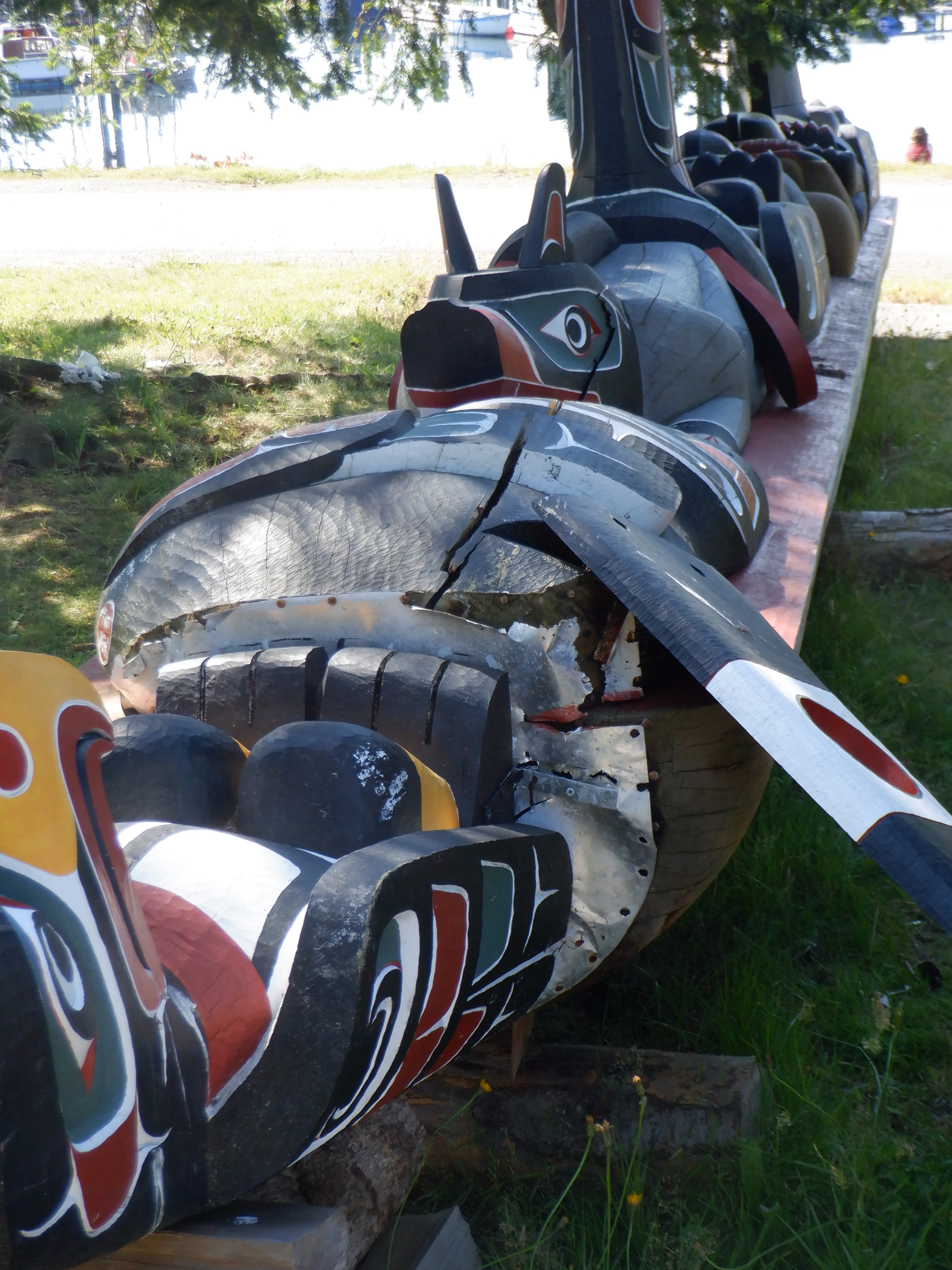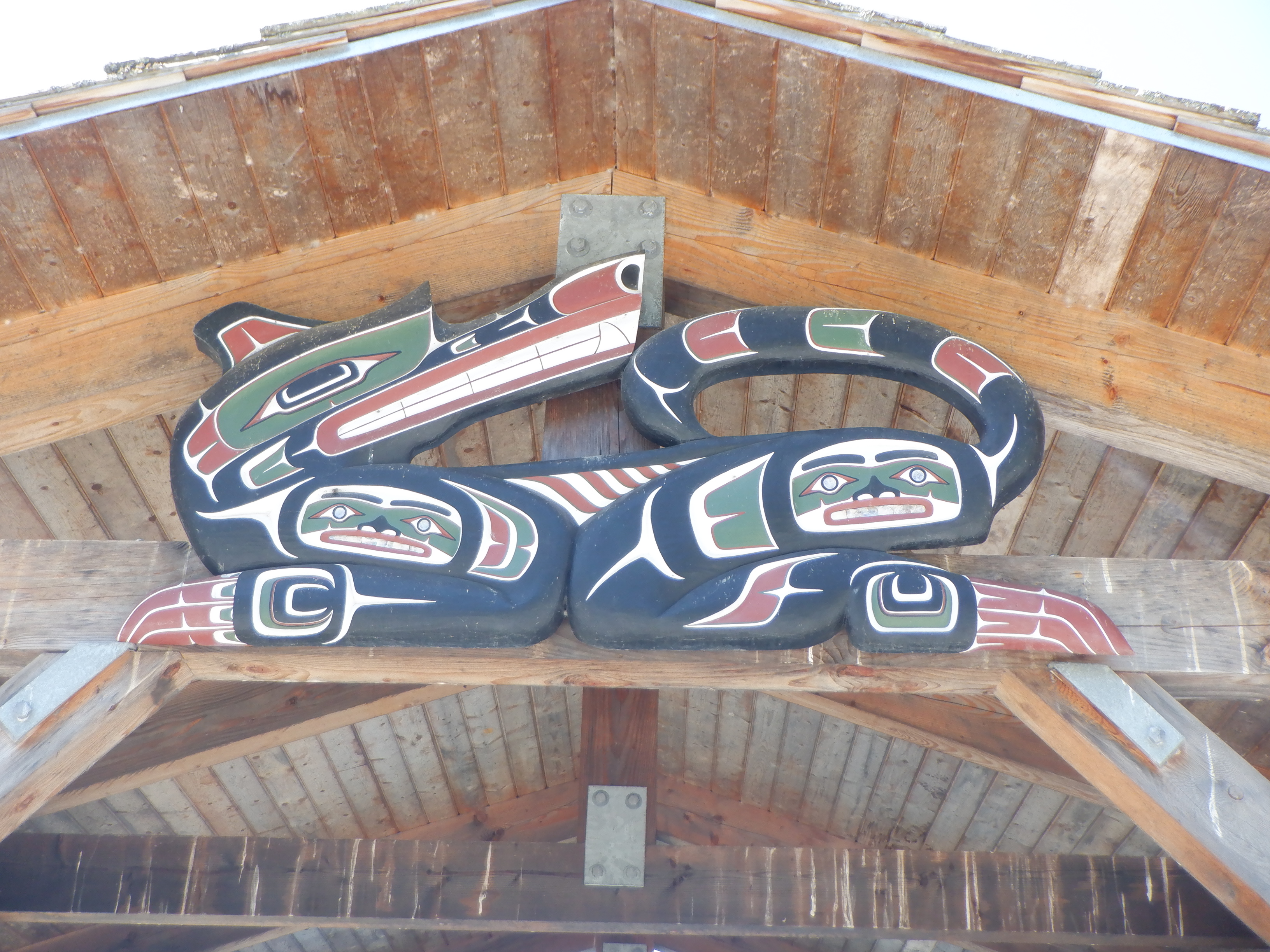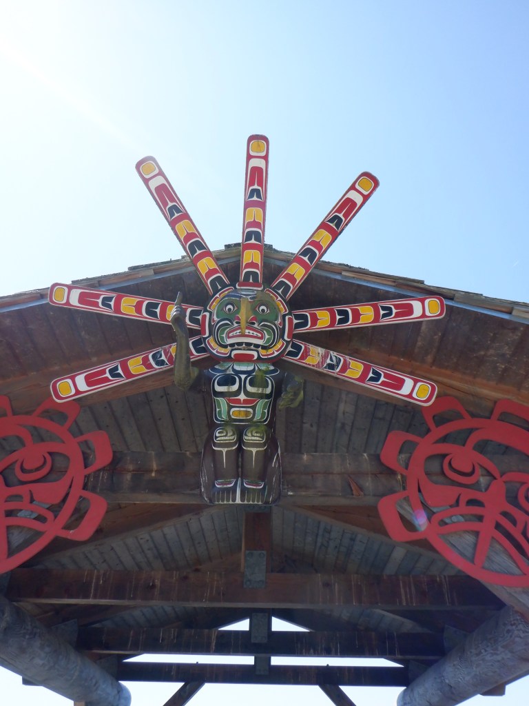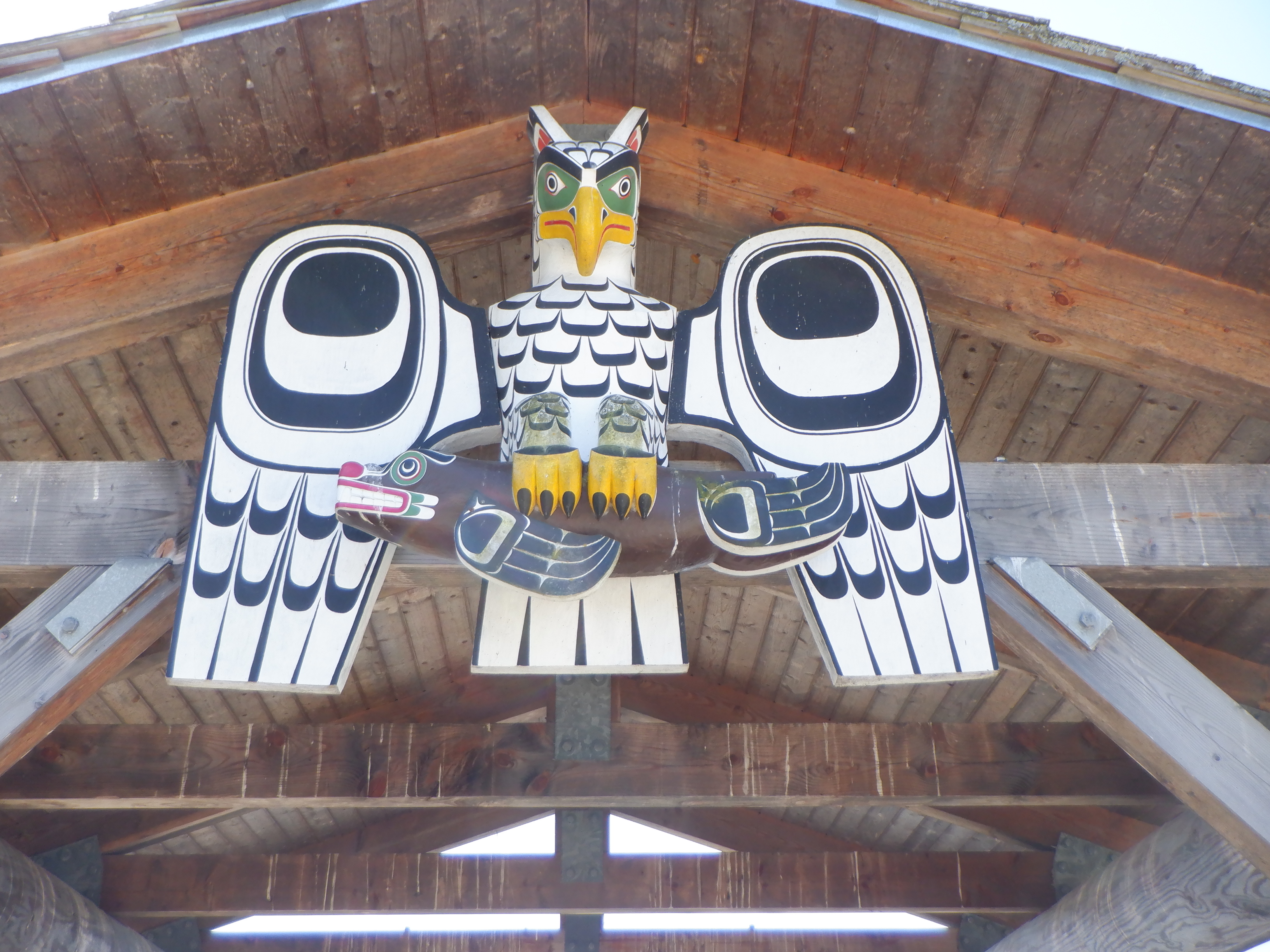 Stammen der bor her (og har altid boede her, hedder ’Namgis. Øen er fyldt med totempæle og der er en tæt koncentration af dem i den originale ’Namgis begravelsesplads. Det er ikke tilladt at entrere begravelsespladsen for ikke ’Namgis. Men vi kunne da stå udenfor og tag billeder af nogle af de mange totempæle, hvilken vi gjorde.