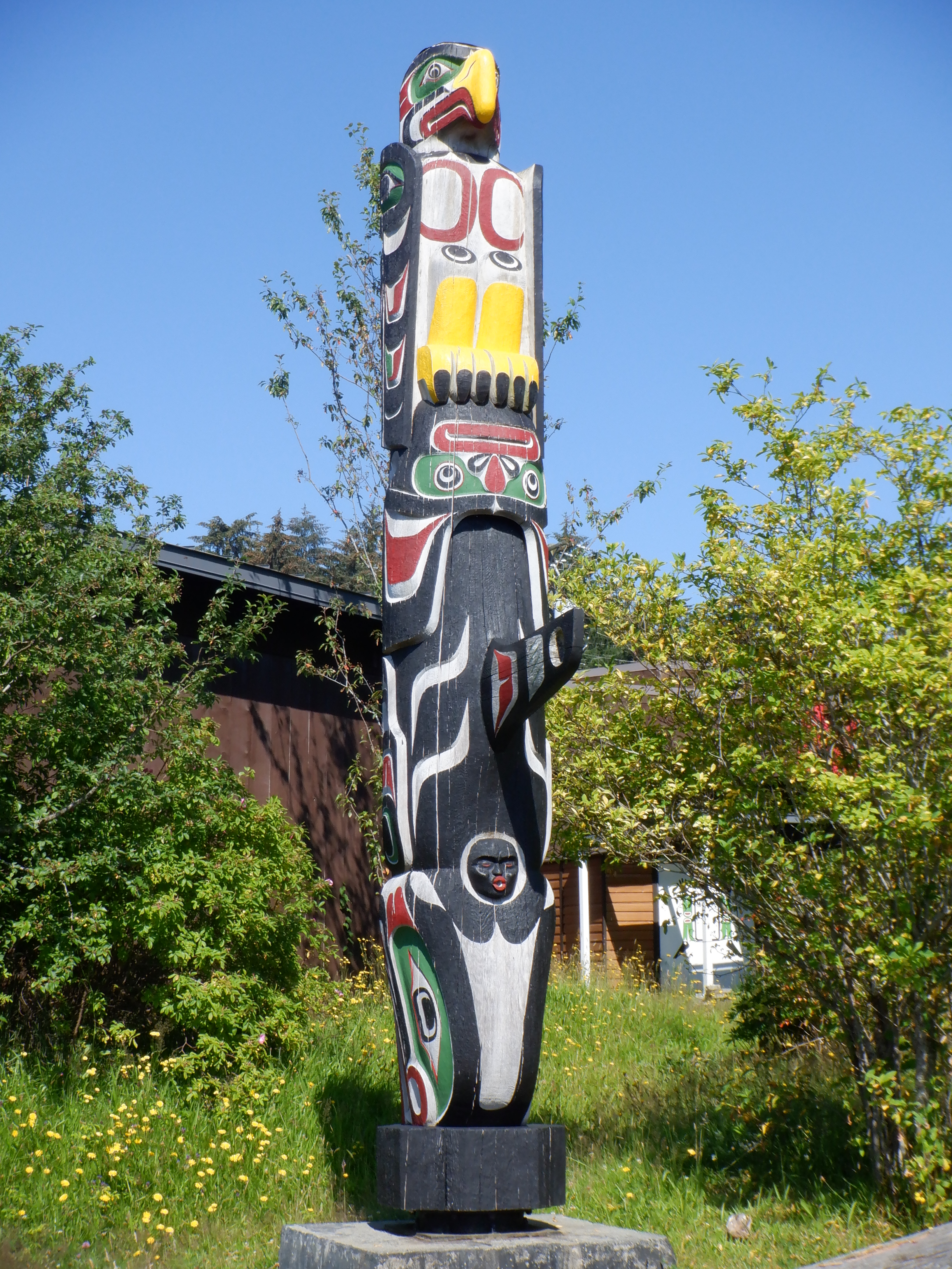 Overalt på øen er der Totempæle. Mange huse har dem foran – flere af den er velkomst pæle. Der bor flere meget berømte pælehuggere her og vi så flere pæle der var under udarbejdelse.