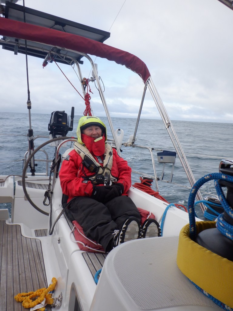 Det klarer op og vi får lidt sol. Stadig ingen vind, først om aftenen og gennem natten får vi 10-14 kn vind, men fra NNE og ikke fra NV som vejrfilerne har forudsagt. Med sejlene sat men ikke uden hjælp af motoren kan vi selv i modstrøm holde en fart på mindst 5 kn. Det er nødvendigt, for herude har man ikke lyst til at ligge og vente på mere vind, det gælder om at komme hurtigst muligt i havn.