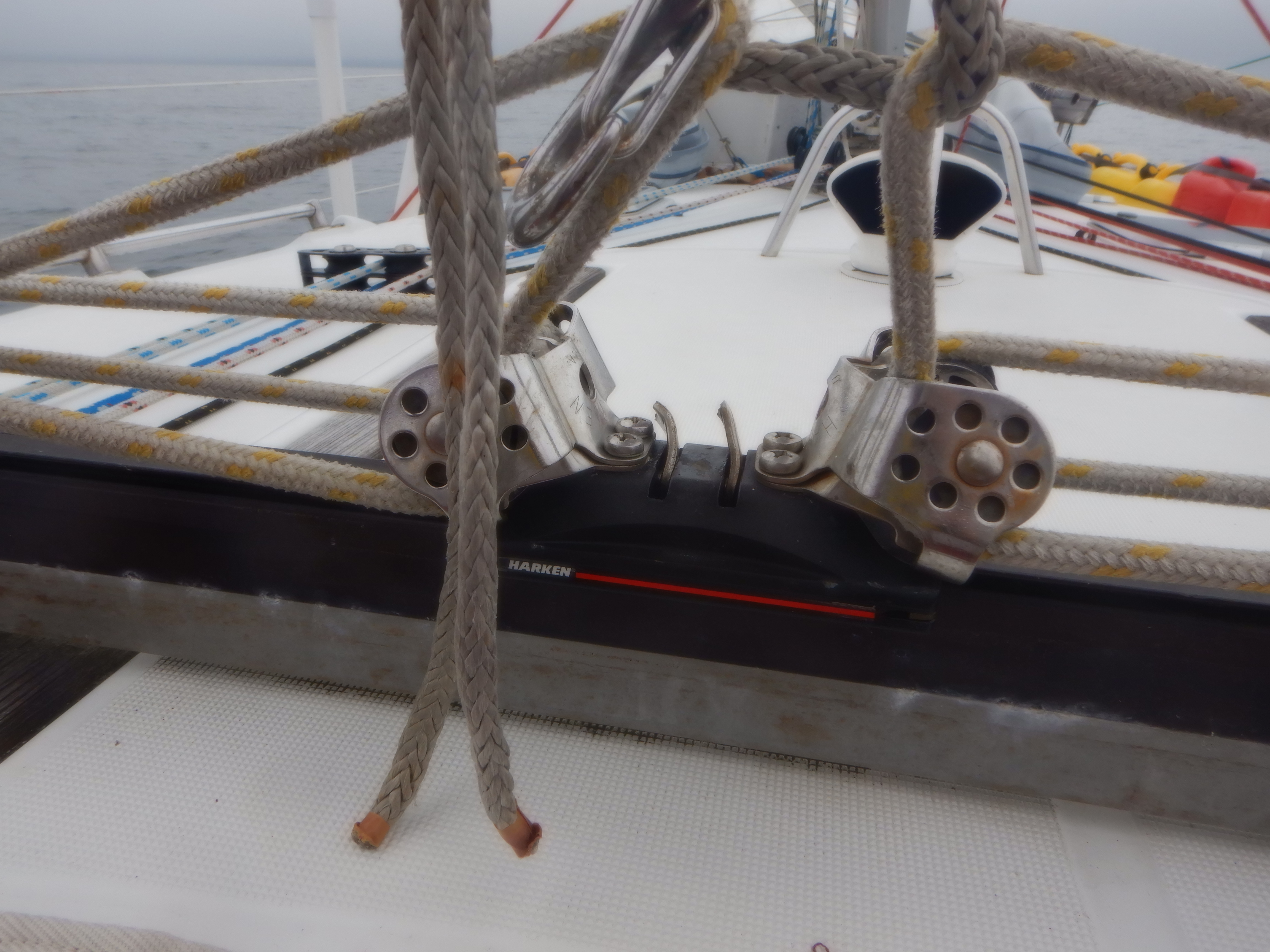 Bommen er tilbage på midten. En ny og stærkere softsjækkel er påmonteret. Vi bliver hurtig enig om, at nu er det sikreste at bjærge storsejlet, og vi må forsætte vores sejlads kun med genuaen. Lige nu går vi 6,5 kn kun på riggen, så et lille bitte lommetørklæde af genuaen sættes medhenblik på, at vi bedre kan holde styregang.