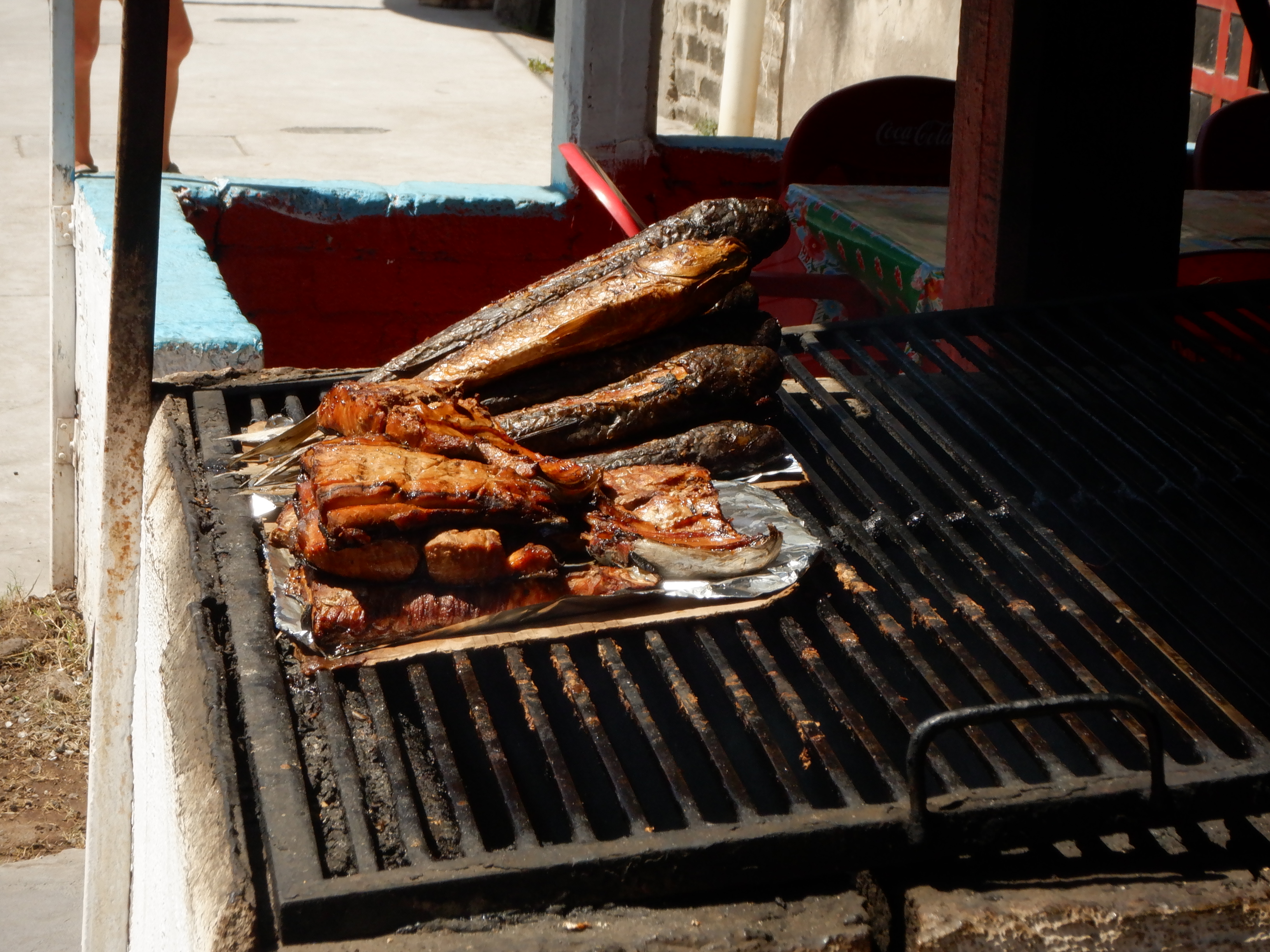 Tilbage til byen. San Blas har så mange gaderestauranter at det virker umuligt at de alle sammen kan tjene penge. Jeg mener – hvor mange mennesker går ud og spiser hver dag? Alle restauranterne har grills ude, nogle af dem er fyret op med træ, andre med flaskegas. De har alle sammen et bord ude foran hvor de udstiller rejer, røget og grillede fisk.