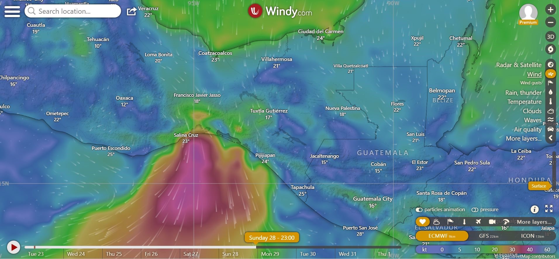 Da vi når 2/3 del af vejen op i bugten, tjekker vi vejrudsigten igen (tak til Starlink og Hr. Musk). Vejrudsigten holder, de kommer ingen vind før søbrisen starter næste dag. Vi beslutter os derfor for at ”skære” toppen af bugten af og drejer direkte over mod kysten på den anden side af bugten. Vi følger herfra ikke strategien længere, da vi sejler mellem tyve og tredive sømil fra kysten og forkorter hermed turen med mange sømil. Søbrisen næste dag udebliver, og vi fortsætter med at motorsejle helt ned til Puerto Chiapas, hvor vi finder en skøn marina med pool og en god restaurant.