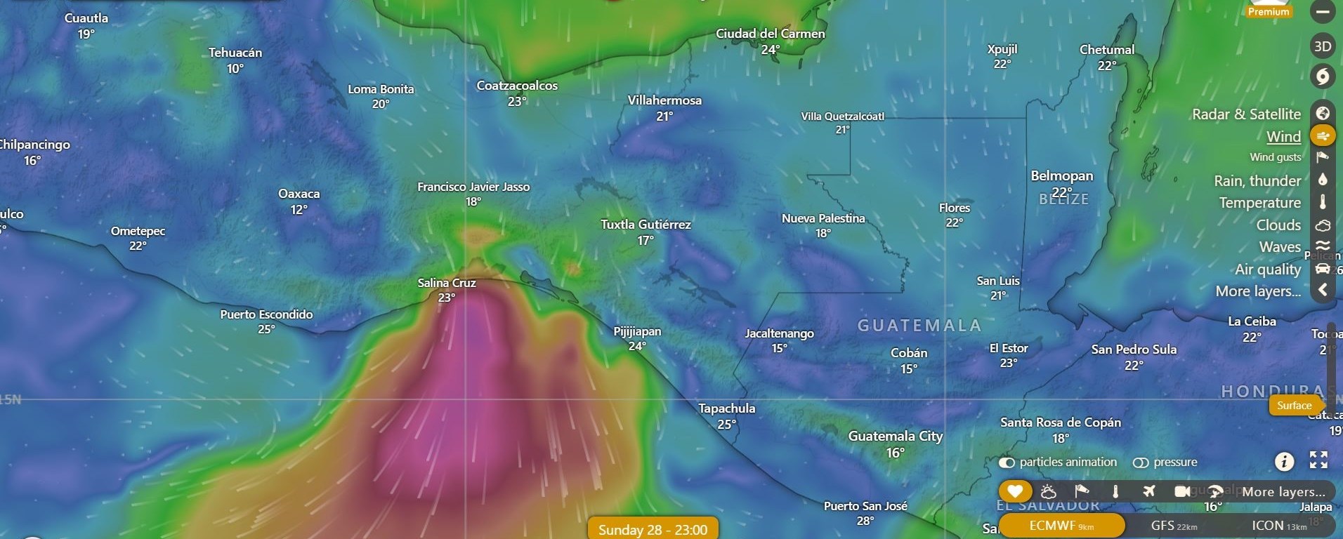 Bugten, der er 230 sømil bred, det vil sige afstanden fra Chahué til Puerto Chiapas, ligger helt syd på stillehavssiden af Mexico lige inden grænsen til Guatemala. Mexico er her meget snævert. Nordlige vinde i den Mexicanske Golf på atlanterhavssiden, som oftest er forårsaget af et højtryk, sender disse nordlige vinde ind gennem en sprække i de høje bjerge. Denne ”tunnel” er kun tyve sømil bred, men sender en tunnelvind som et missil ud i bugten. Disse Tehuano vinde er kraftigst i december og januar, hvor de kan nå op i orkanstyrke og kan opstå i løbet af kun tolv timer. Det gør det svært for langsomt sejlende sejlere som os at finde et vejrvindue, der holder i mindst to døgn.