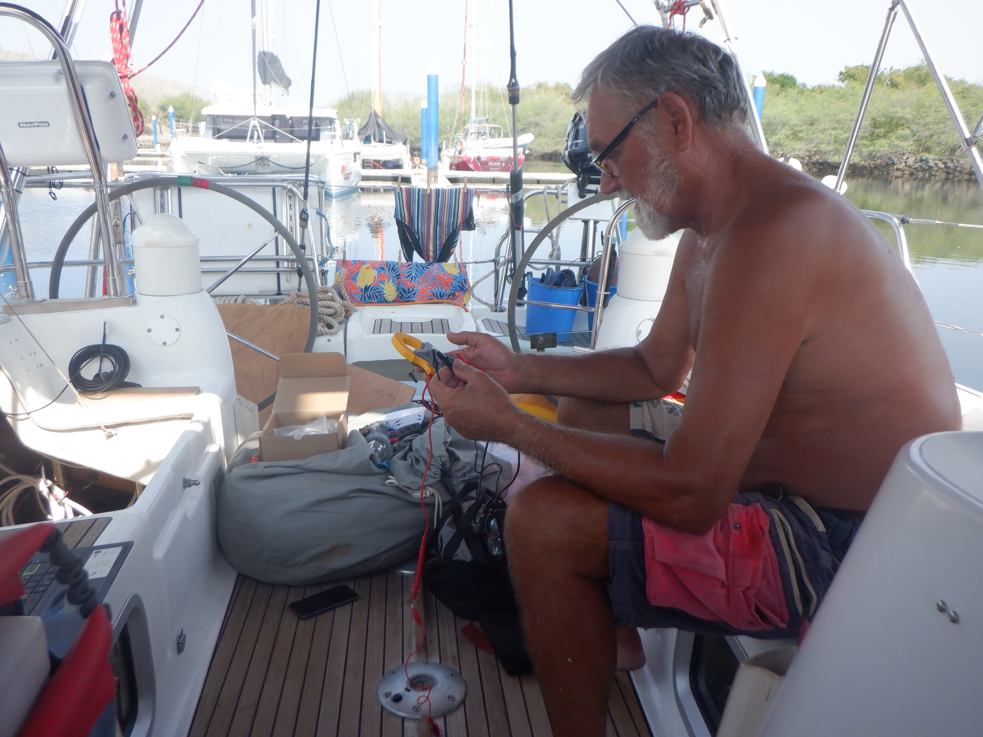 Jeg drejer motornøglen, og der sker absolut intet – starterbatteriet er dødt –hvorfor? Det er aldrig sket før. Panikken indfinder sig hos os begge, da vi de næste par dage har et perfekt vejrvindue. Carsten fór rundt og måler på diverse ting og rådfører sig med vores canadiske ven Gentry (professionel motormekaniker), der hjalp med at installere lithium batterierne. Som jeg har forstået, er computeren, der styrer, at starterbatteriet skal oplades først og derefter husbanksbatterierne, at den er ”gået i baglås”, hvorfor husbanksbatterierne har taget strøm fra starterbatteriet i løbet af natten. Gentry anbefaler Carsten at ”boote” computeren og starte den op igen, hvilket løser problemet, og en halvtime senere kan vi starte motoren.