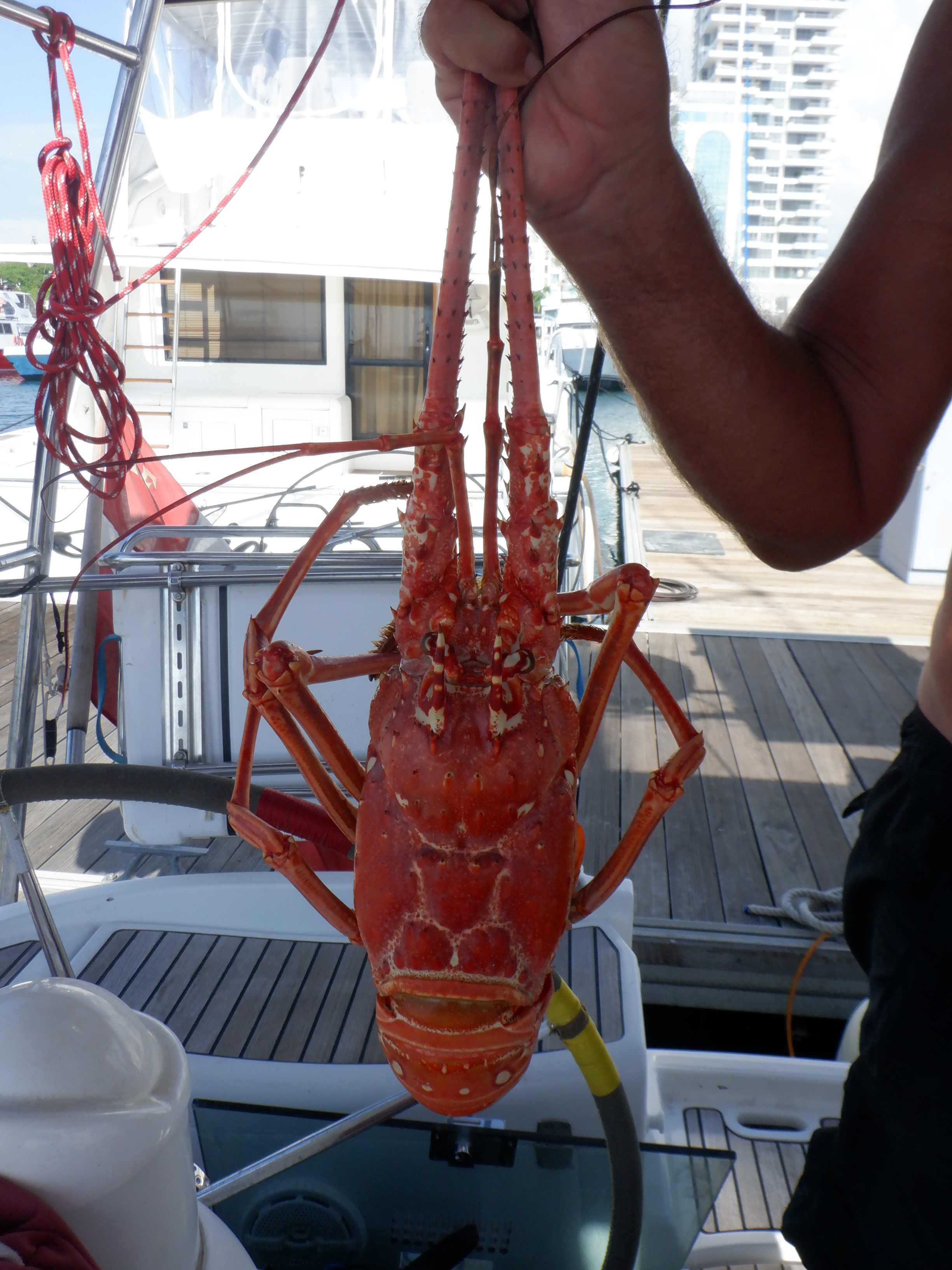 En lokal fisker der ligger ved siden af os i marinaen kigger forbi en dag og spørger, om vi kan lide hummer? Jada! siger vi. Hvorefter vi får en ordenlige krabat. Hummer er meget større her i Caribien, og de er uden klør, men deres smag er ikke helt så god som dem fra de nordlige vande. Denne smagte nu meget godt.