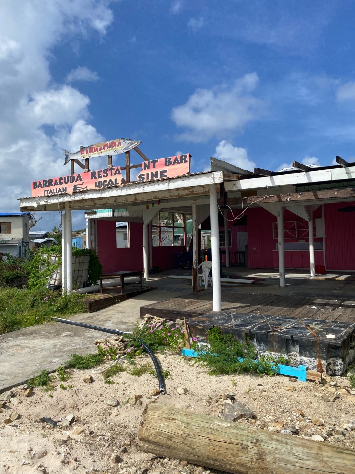 Nede ved havnen var der en telt by. Her boede de hvis huse var totalt ødelagt. Ved tovet (det der var tilbage af centrum) var der et suppekøkken. Da vi kom sidste gang var der en utrolige charmerende dinghy havn. Man sejlede ind under en lille bro og lagde til ved en træbro. Her var der en god bar og levende musik. Ved siden af var der en lille italiener hvor Vinni og jeg fik den bedste tun carpaccio vi nogensinde har smagt. Alt var væk. Barens vægge stod, samt en smule af taget. Den lille italiensk restaurant var kun murbrokker. Den charmerende lille beton bro man sejlede gennem var der endnu, men den var løftet op af vandmasserne og flyttet lidt til den ene side. Det hele skal bygges om.
