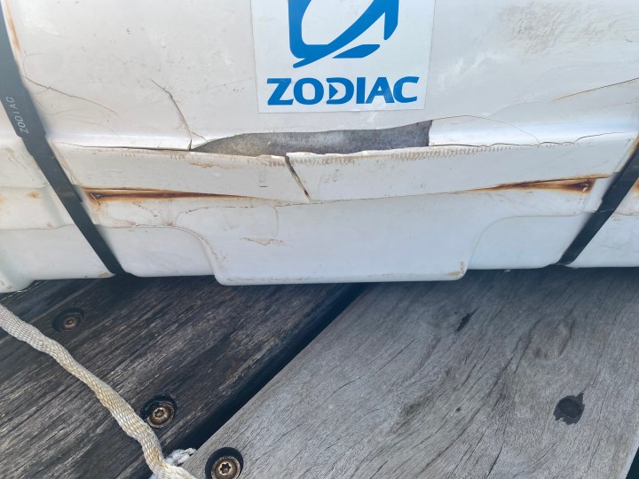 N.B. – Breaking News! Da vi hejsede redningsflåde ned i dinghien viste det sig at den glasfiber/plastik kasse den er i har revner og der er et par steder hvor den er knækket. Bad news! Forhandlerne solgte os en ny (ikke Zodiac) for kr.500 mindre end det ville koste at få den gamle servicerede og købe en ny kasse.