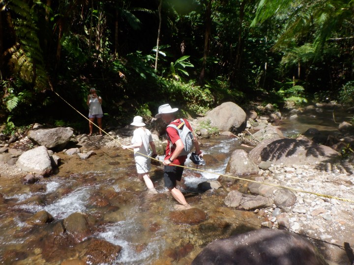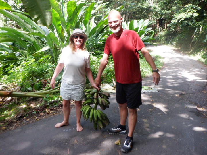 Afsted til Syndicate Falls og regnskov. Dejlig tur og da jeg havde taget min machete med kunne vi fælde et banantræ så Rikke go Karsten kunne blive ægte langturssejlere med en bananklase hængende fra targabaren.
